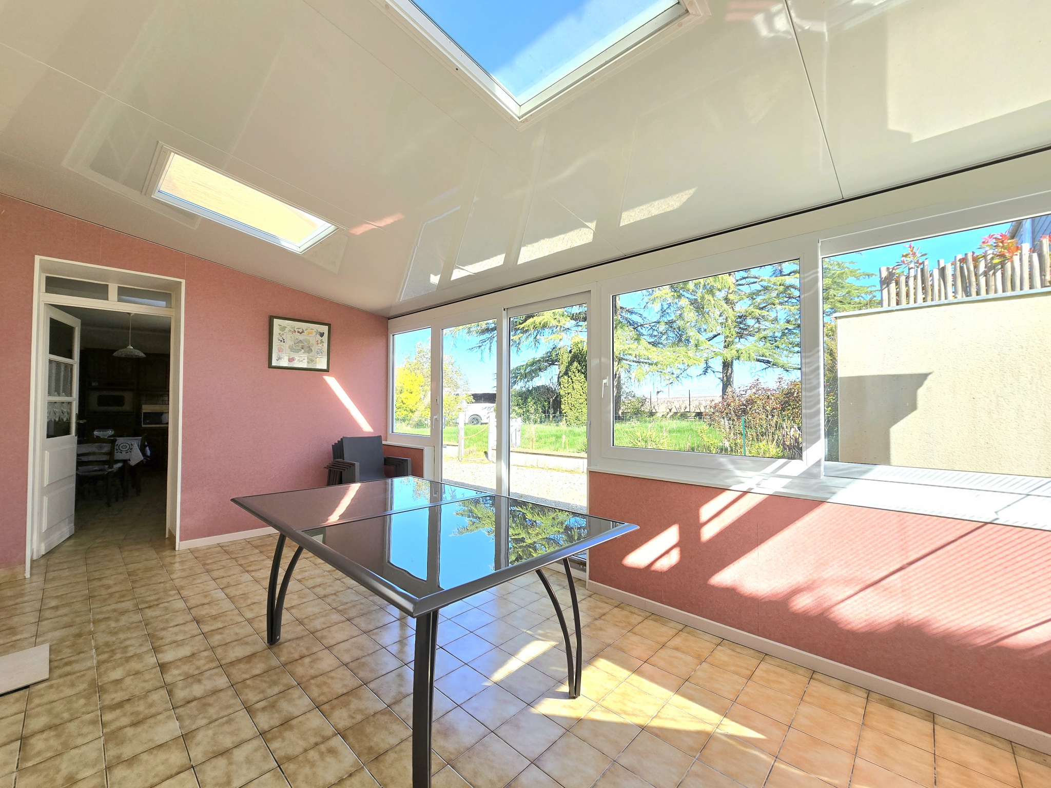 Dès l'entrée, vous serez charmé par une vaste pièce de vie équipée d'une cuisine ouverte et aménagée, ainsi qu'une cheminée avec insert pour vos soirées d'hiver. Une véranda chauffée et isolée de 16 m2 prolonge cet espace, offrant une vue directe sur le jardin.