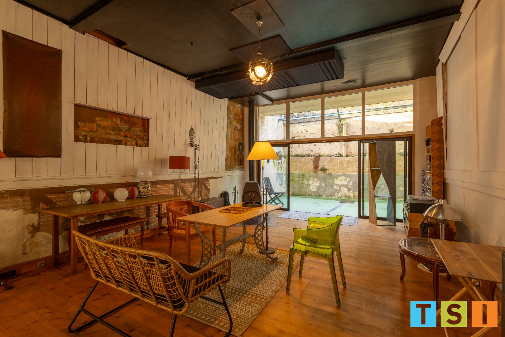 - Au RDC : une entrée, une buanderie, un WC, une cuisine équipée ouvrant sur une verrière de 61 m² haute de 6 m, vous laissant profiter d'un jardin d'hiver où vous trouverez l'ancien lavoir de l'hôtel ainsi que le puits, un séjour de 46 m² (ancienne salle de restaurant de l'hôtel) s'ouvrant lui même sur une terrasse extérieure de 16 m².