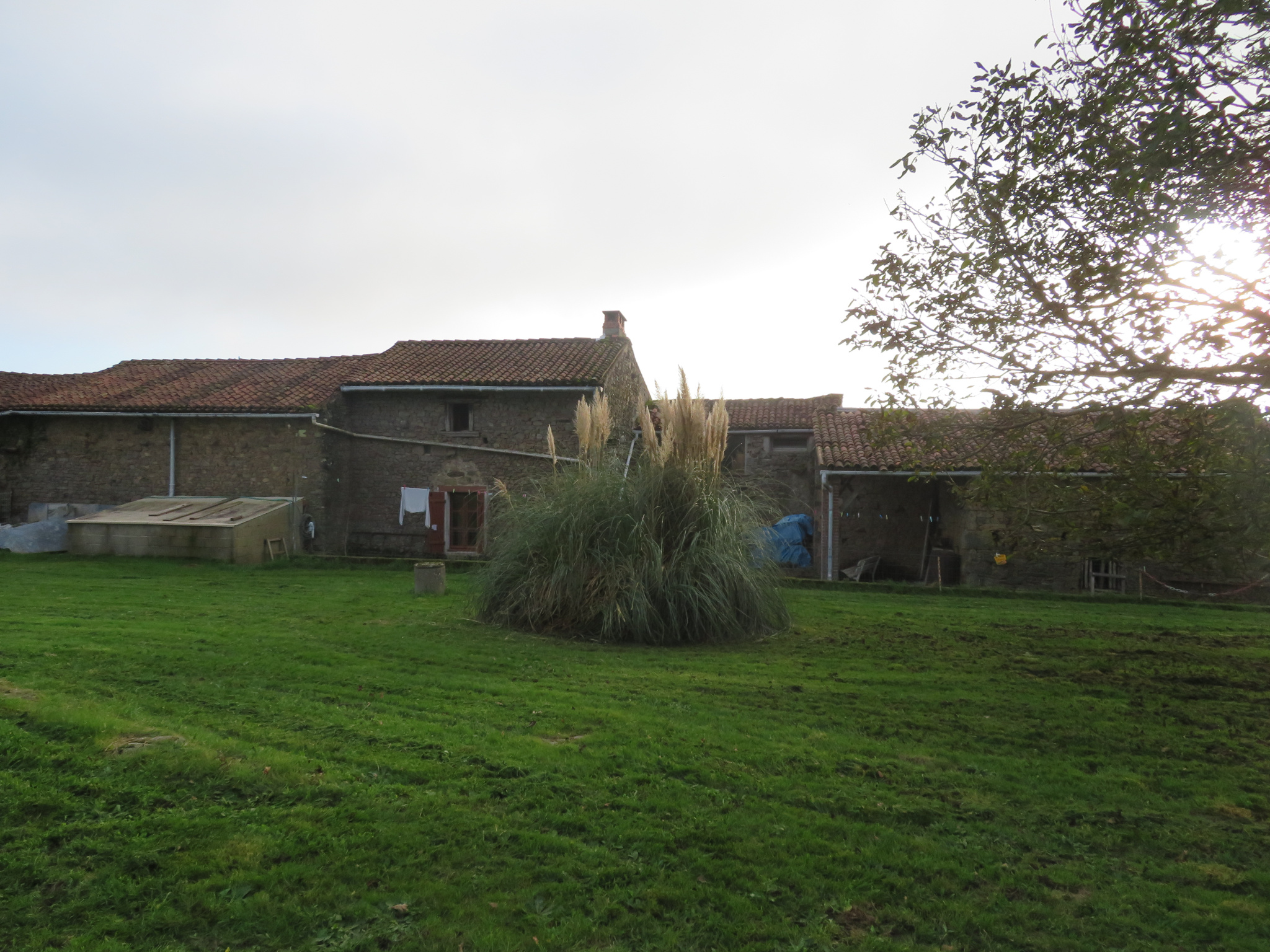La première grange est attenante à la maison. La seconde est de l'autre côté et est attenante à un ancien fournil. Le jardin se trouve à l'arrière de la maison. Il y a également des petits toits de l'autre côté de la route, en face de la maison.