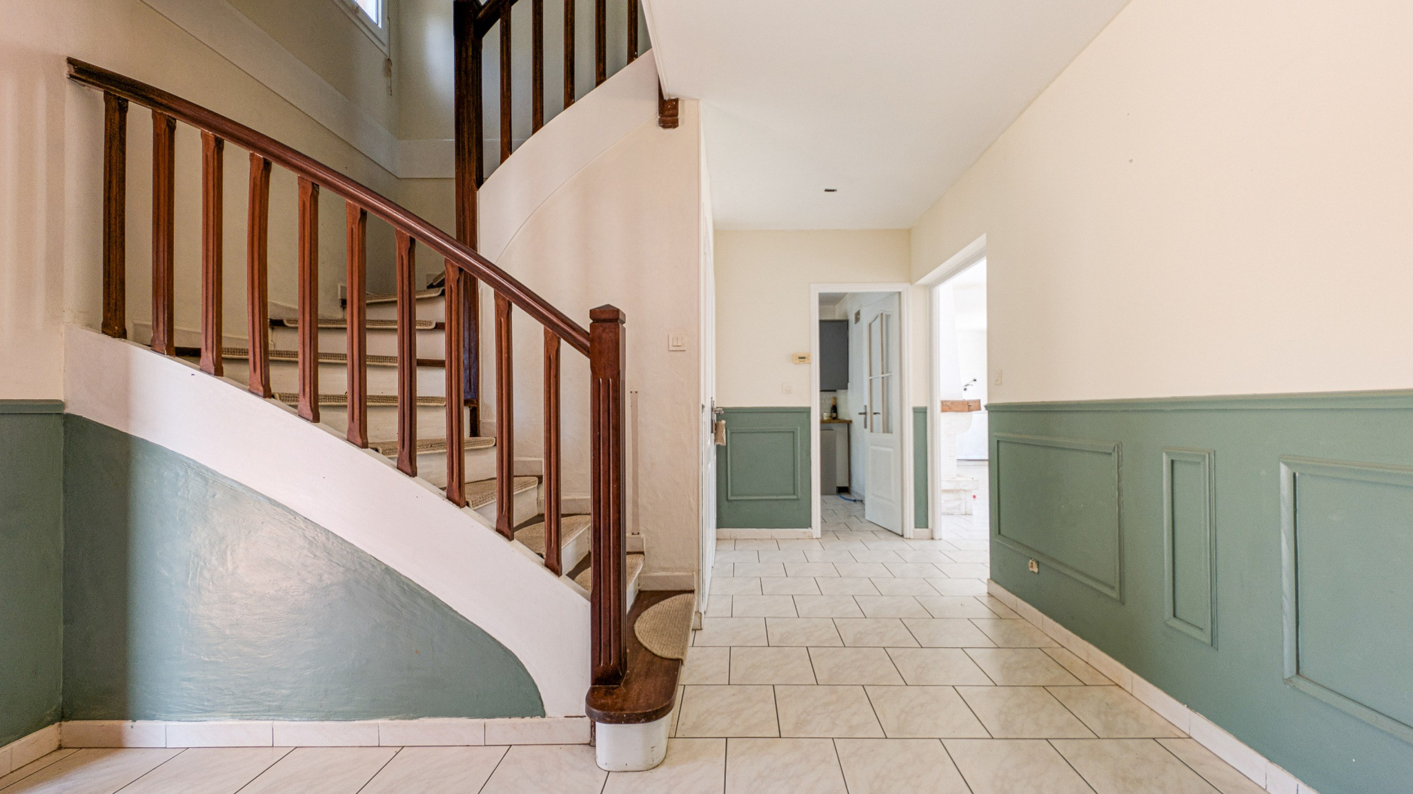 Intérieurs Élégants et Fonctionnels Les espaces intérieurs, décorés avec goût, sont carrelés au rez-de-chaussée, tandis que le premier étage dispose d'un élégant revêtement en bois composite.