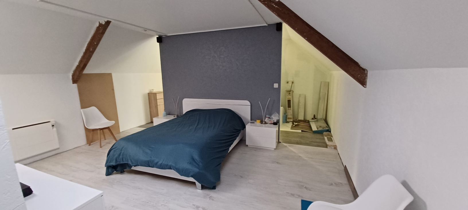 A l'étage une suite parentale de plus de 27m2 avec dressing, coin nuit et salle de bains, la douche et la baignoire sont à finir selon vos goûts.