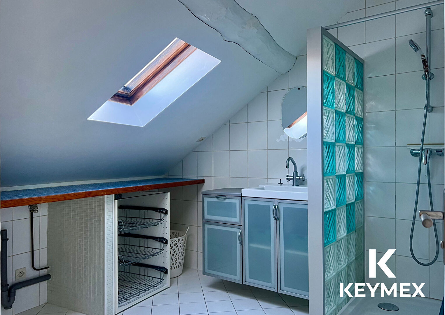 Ce duplex lumineux se compose au RDC d'un salon, d'une cuisine ouverte aménagée et équipée (hotte, plaque, four, frigo, lave vaisselle) et d'un WC.
