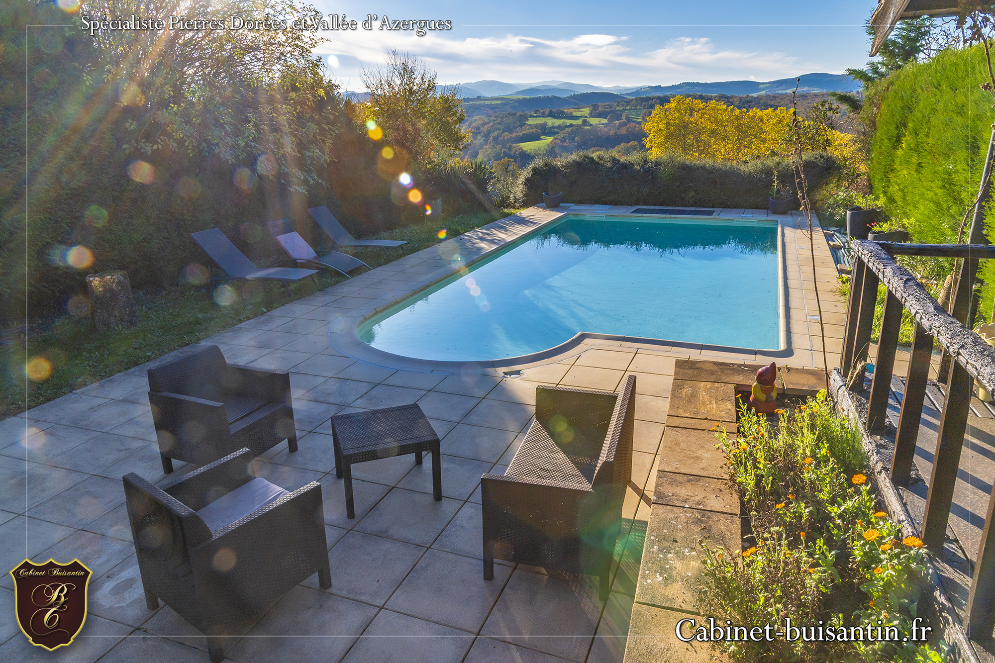 EXCLUSIVITE - A 5 minutes du centre village du Bois d'oingt (commerces, écoles, collèges) et à 2 min. de la gare, commune de LEGNY. Nichée dans un environnement paisible et bénéficiant d'une superbe vue dégagée, cette élégante maison en pierres d'environ 210 m2 habitables incarne tout le charme du Beaujolais. Le rez-de-chaussée accueille une cave voûtée, un salon de réception ainsi qu'une chambre avec salle d'eau et WC. Cet espace dispose d'un accès indépendant, idéal pour recevoir famille et amis, ou pour aménager un bureau destiné à une activité professionnelle. Au premier étage, vous découvrirez une cuisine entièrement équipée donnant accès sur un vaste séjour chaleureux avec poêle à bois, un salon pouvant facilement être transformé en chambre supplémentaire, une salle d'eau avec WC et une buanderie. Le deuxième étage propose trois belles chambres, dont une chambre cathédrale de 25 m2, ainsi qu'une salle d'eau et des WC séparés. Implantée sur un terrain joliment arboré de 870 m2, la propriété s'ouvre sur une charmante cour pavée avec préau, prolongée par un espace engazonné et une piscine de 9 x 5 m. Un chalet en bois complète l'ensemble et offre une vue imprenable sur les collines environnantes. Parfaitement entretenue, cette maison allie le cachet de l'ancien au confort contemporain. Lumineuse, fonctionnelle et chaleureuse, elle offre des volumes agréables et une qualité de vie rare.