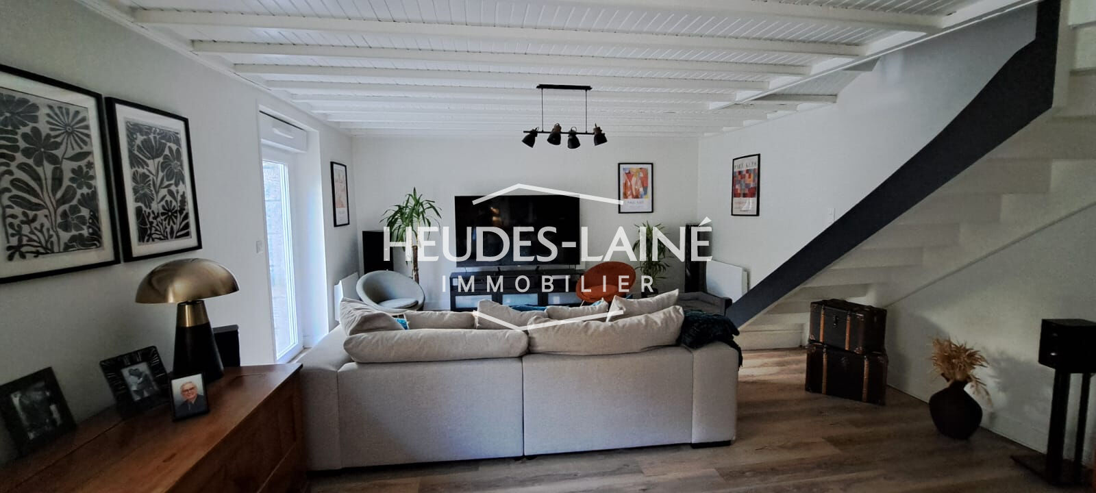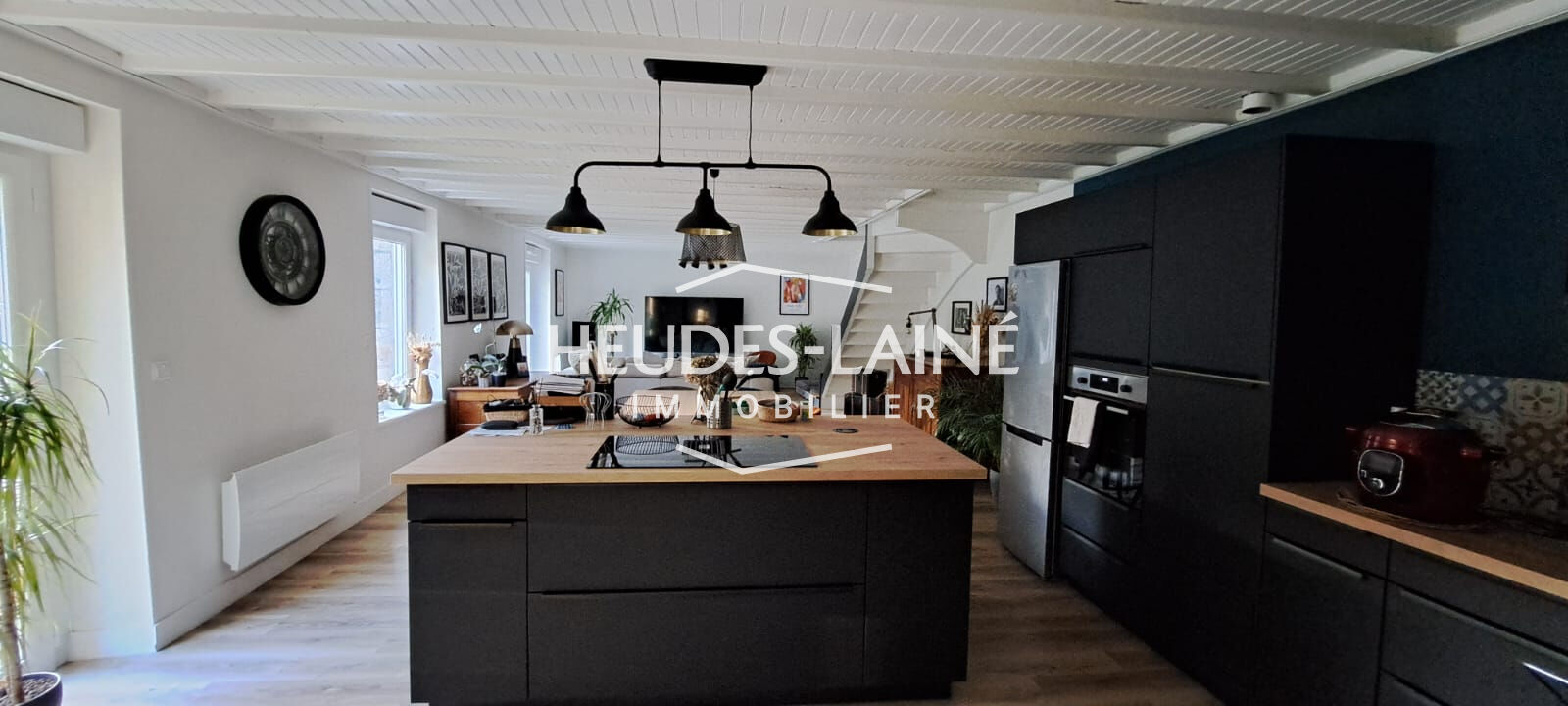- Au rez-de-chaussée : entrée séparée, buanderie, salle d'eau avec WC. Grande pièce principale de plus de 50m2 avec cuisine ouverte aménagée et équipée (four, plaques avec hotte intégrée, lave-vaisselle) et poêle à granulés.