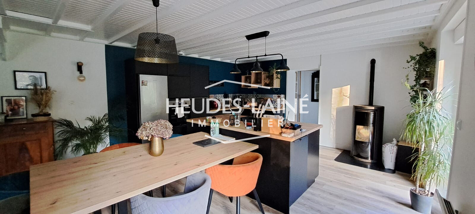 Travaux récents (2021) : menuiseries, cuisine, sols, convecteurs électriques et poêle à granulés.