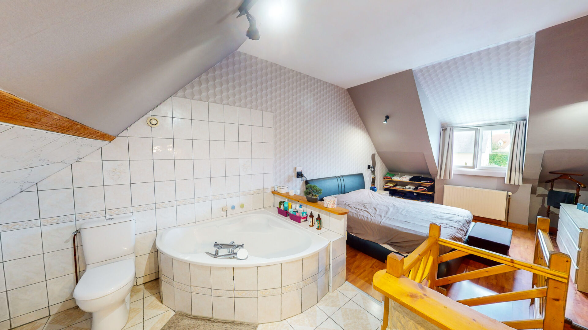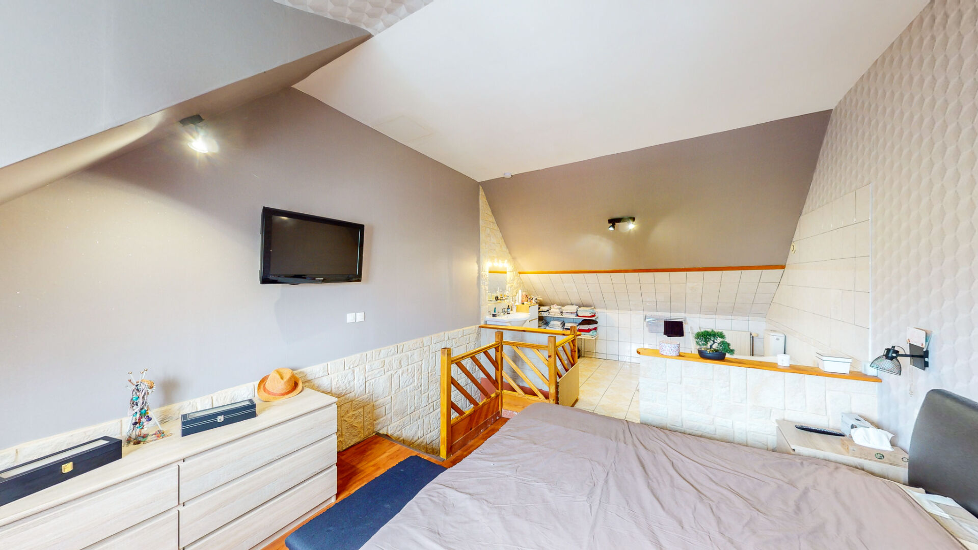A l'étage, vous trouverez une spacieuse suite parentale (avec baignoire d'angle, WC. Un grenier reste aménageable.
