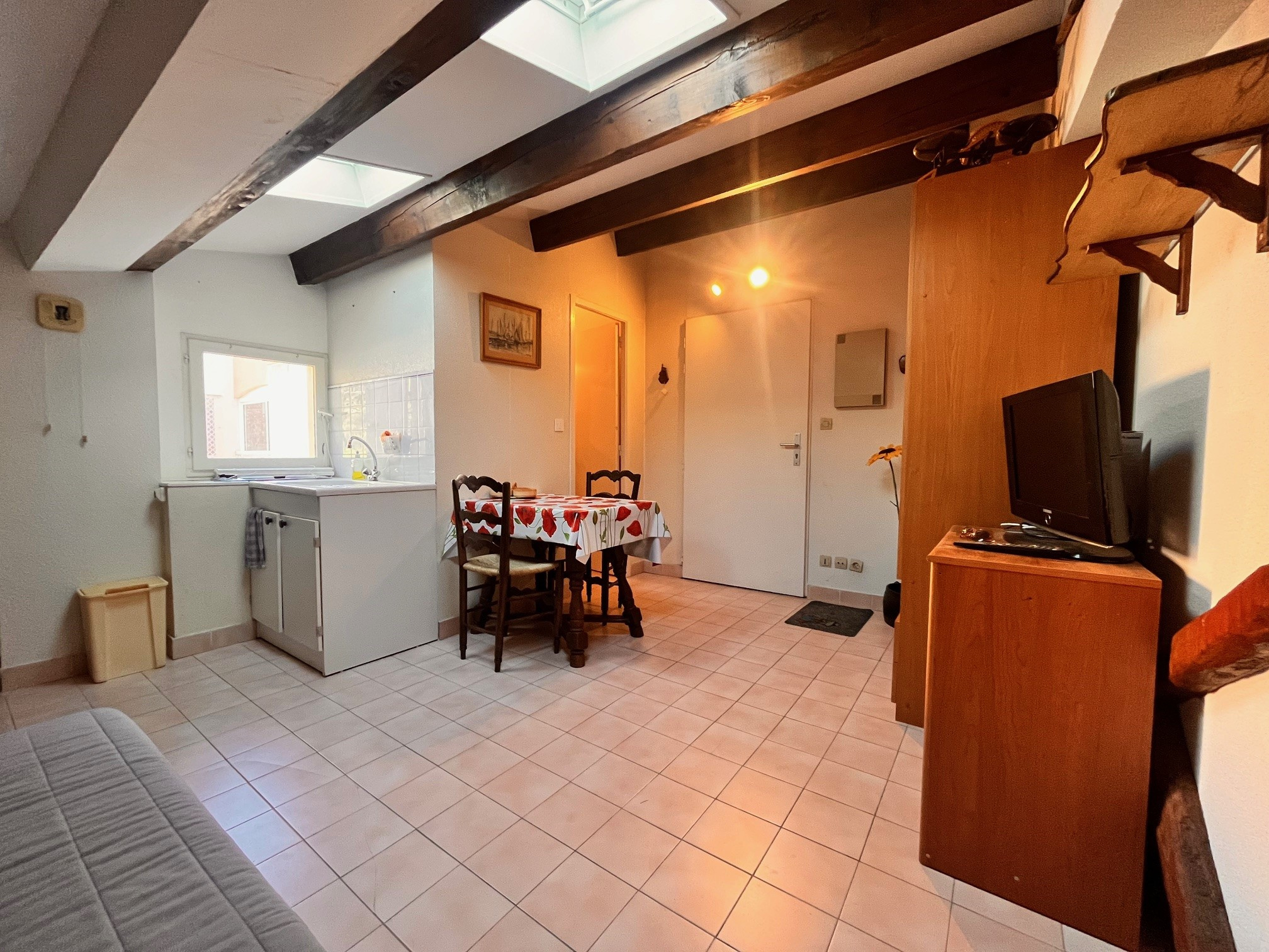 Exceptionnel, A 2 pas des commerces et en bord de mer, dans une résidence sécurisée avec piscine, Appartement studio sous les toits type 'chambre de bonne' d'une superficie de 15m2 comprenant une entrée, kitchenette/séjour, salle d'eau et wc. Idéal en rentabilité saisonnière. A SAISIR !