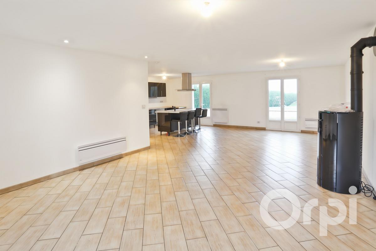 Entre Gisors et Gournay en Bray, Beau pavillon de plain pied sur sous sol total, offrant: Entrée, grande pièce de vie avec séjour double avec poêle à granulés et cuisine ouverte