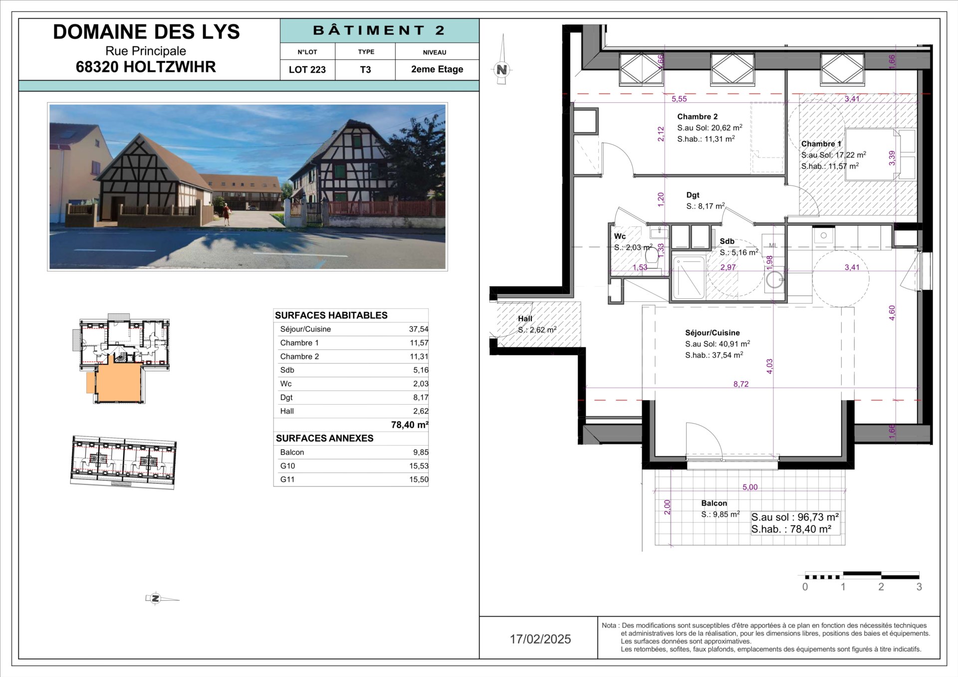 Au calme, spacieux T3 neuf de 78 m² au 2ème et dernier étage avec ascenseur comprenant entrée avec armoire murale, wc séparé, 2 chambres, wc séparé, salle d'eau, pièce de vie de 37 m² avec balcon Sud de 10 m².