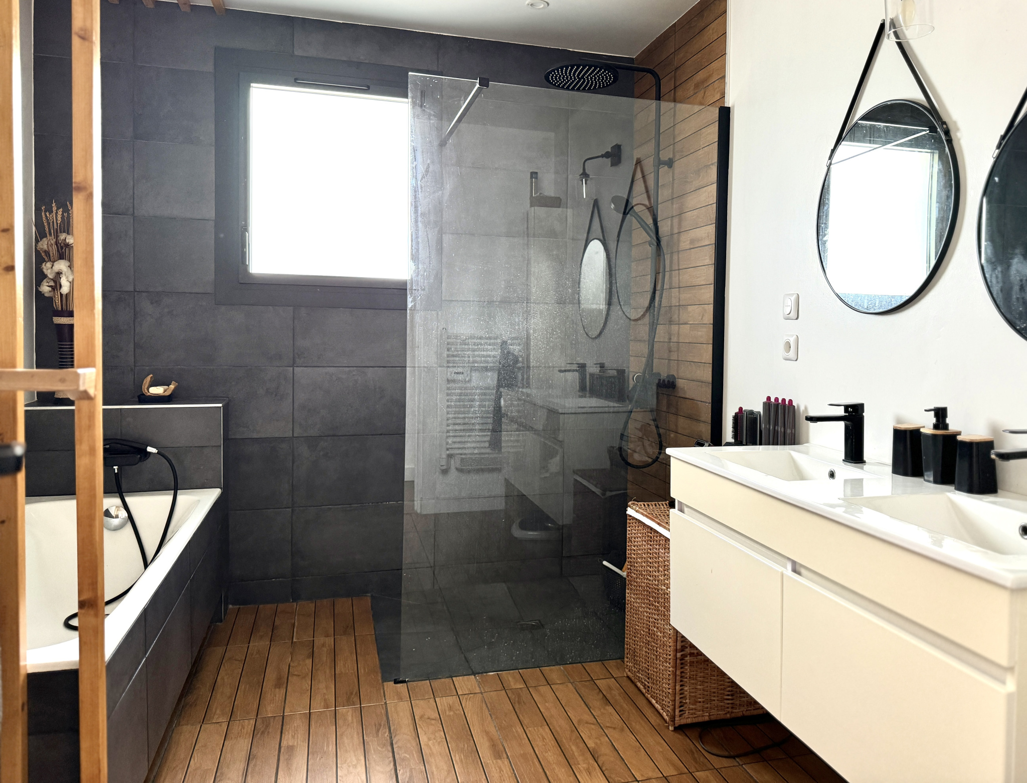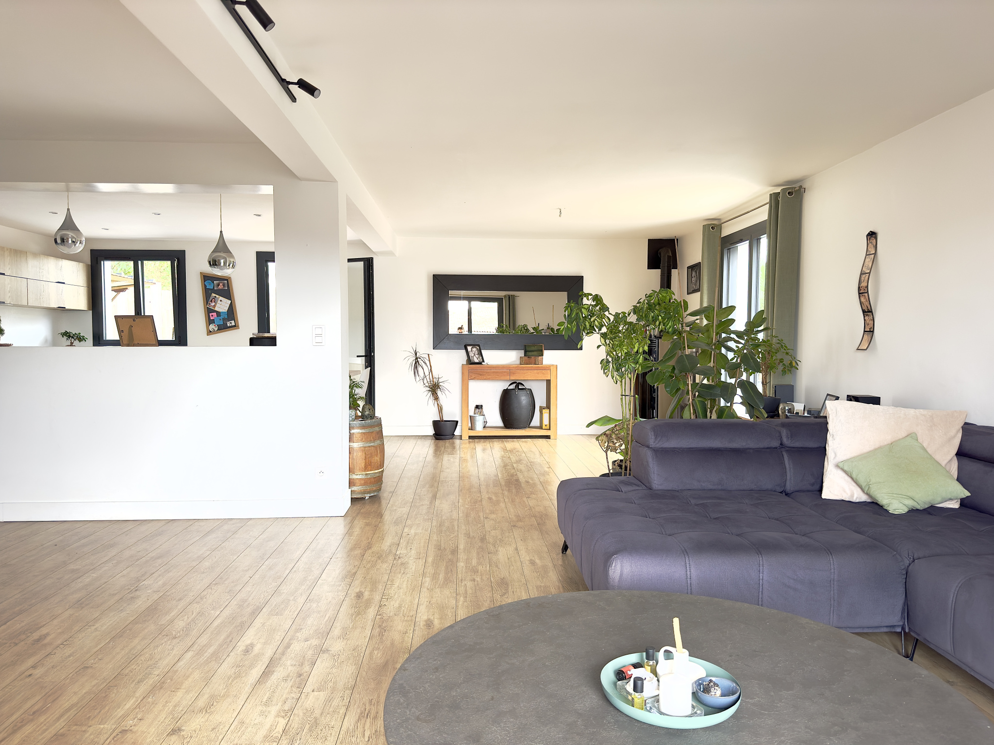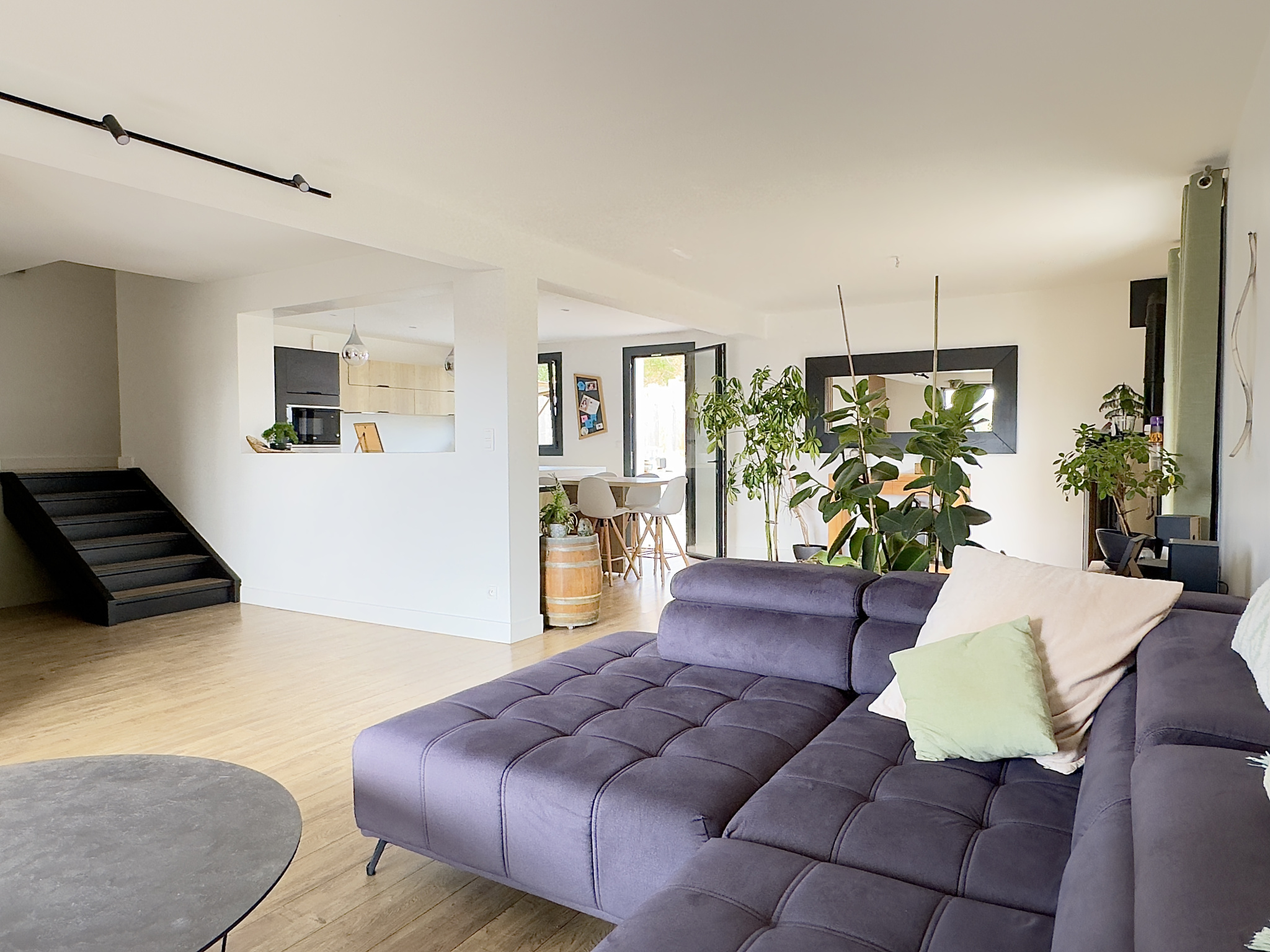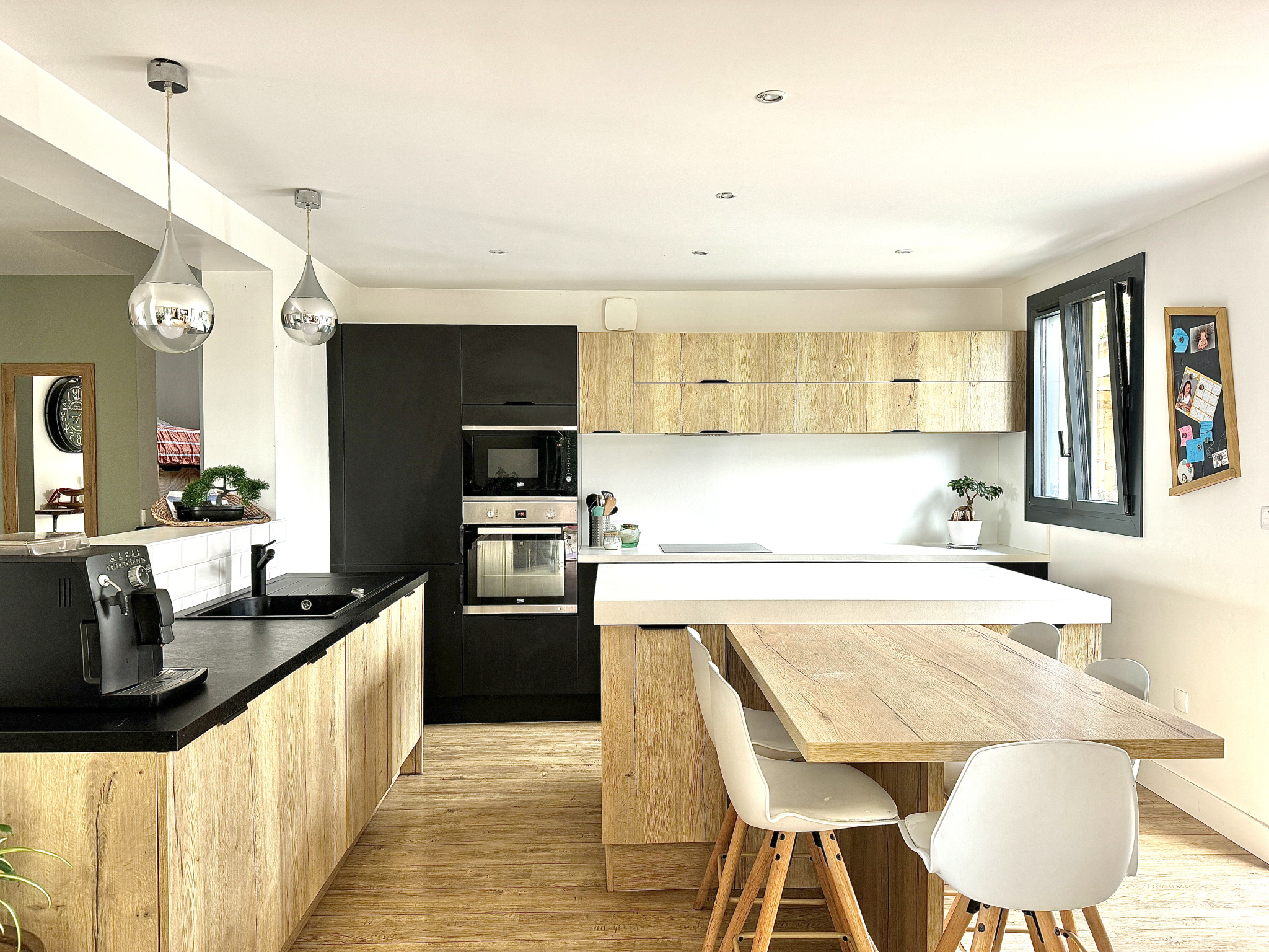 - Un grand salon et sa cuisine dînatoire avec îlot central donnant accès aux 3 extérieurs.