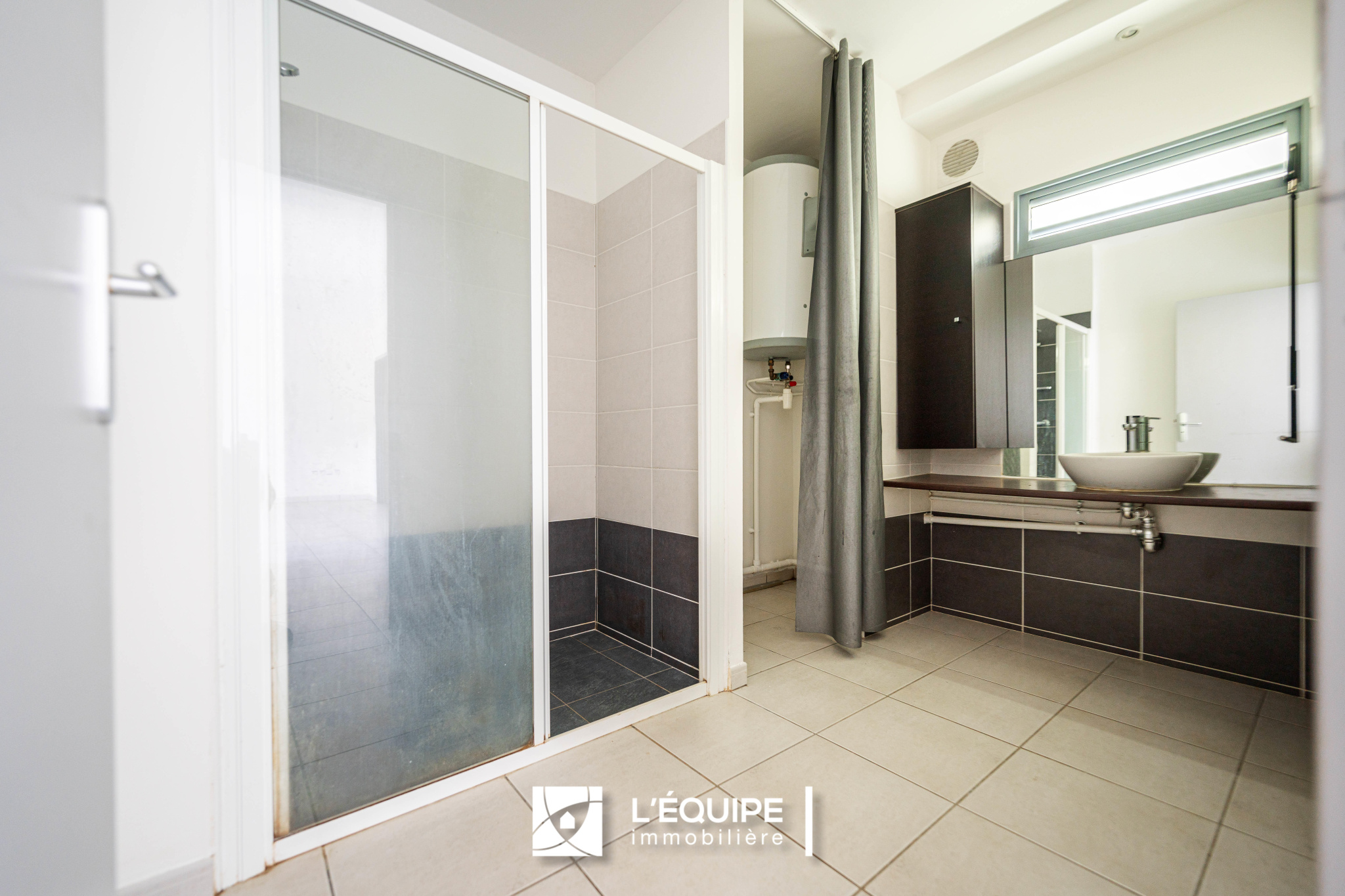 L'appartement est composé d'une grande pièce à vivre (séjour, cuisine américaine), d'une chambre de 13m2 avec placard, d'une salle d'eau et d'un wc séparé.