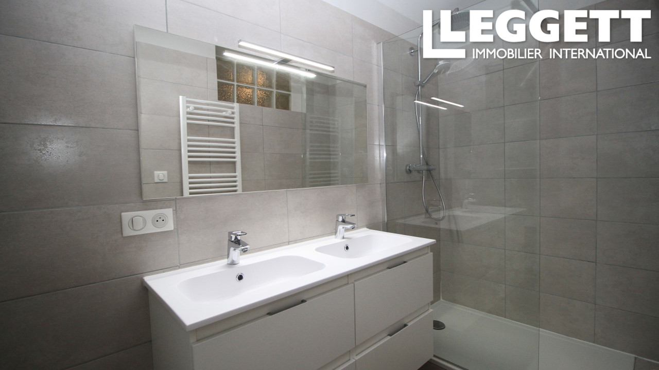 * Une salle d'eau contemporaine avec double vasque, douche à l'italienne et WC suspendus.