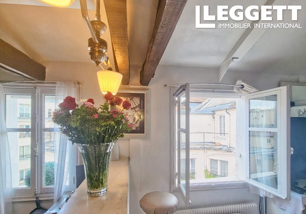 Seul à l'étage par escalier classé monument historique d'un immeuble de 1830 bien entretenu et sécurisé avec belle cour pavée fleurie et local à vélo, ce loft atypique exclusivement côté cour, idéalement niché au calme à l'abri de l'animation urbaine, dispose de 3 grandes fenêtres et de 3 Velux largement ouverts sur les toits de Paris.