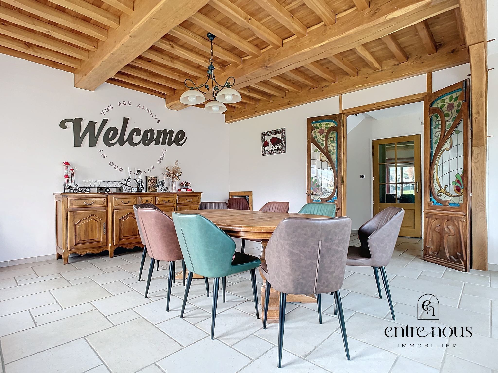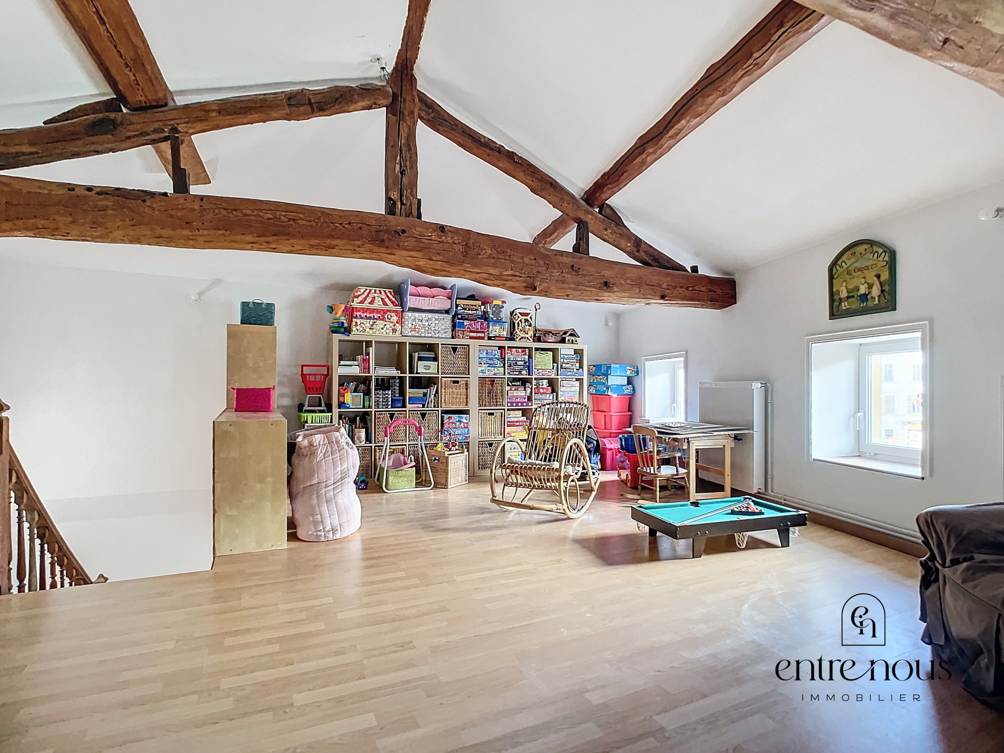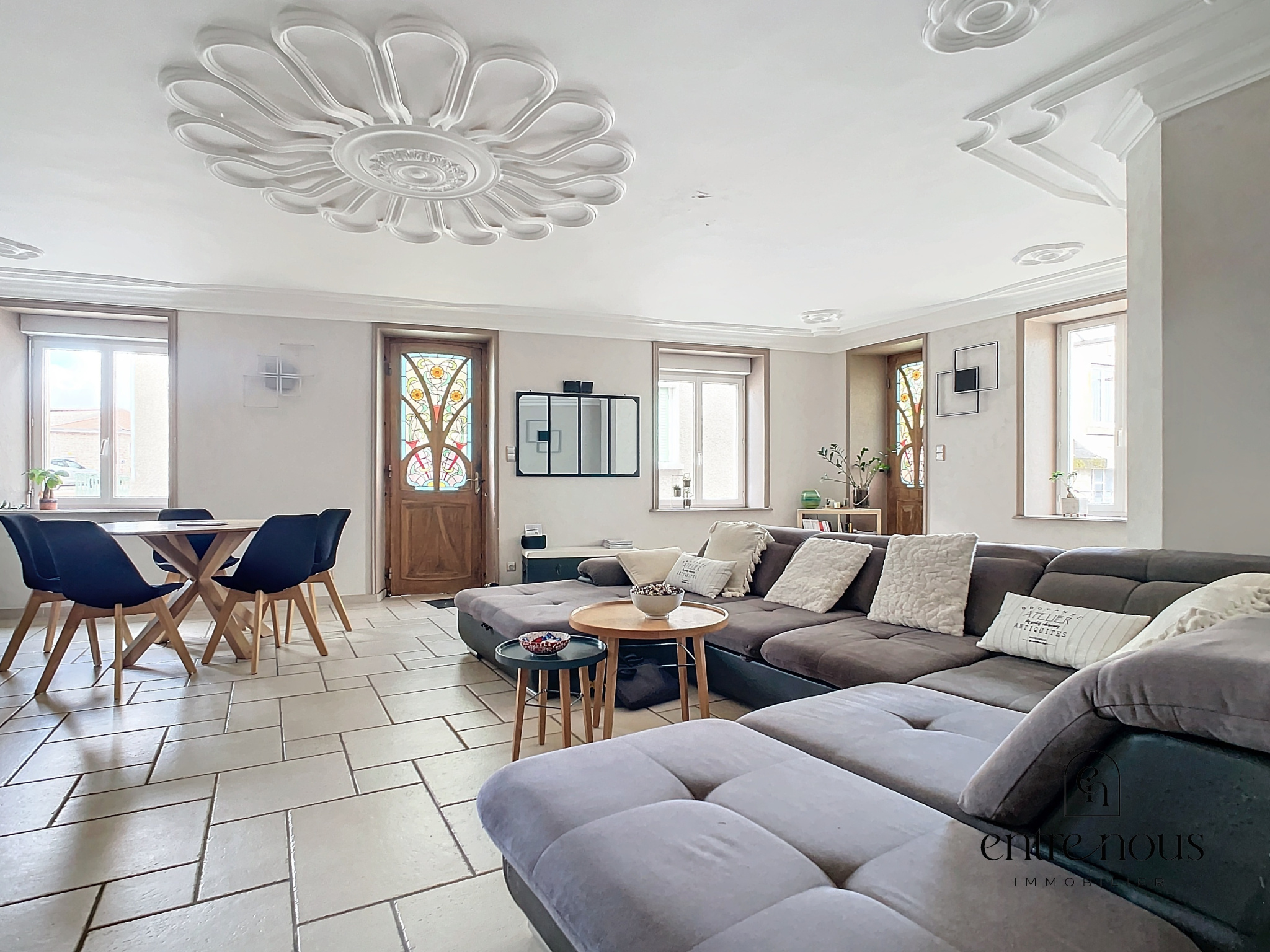 Nouveauté ENTRENOUS-IMMOBILIER, découvrez cette maison de caractère, entièrement rénovée avec soin, offrant 270 m2 d'élégance et de confort à Belmont-de-la-Loire. Au rez-de-chaussée, laissez-vous séduire par un vaste séjour lumineux de 40 m2, une cuisine entièrement équipée de 23 m2 ouvrant sur une salle à manger chaleureuse de 30 m2 et une terrasse idéale pour vos moments de détente. Les portes avec vitraux d'époque, soigneusement préservées, confèrent à cette demeure un charme unique. À l'étage, l'espace nuit propose quatre chambres, dont une chambre de 30 m2 avec dressing ainsi qu'une salle de bain et une toilette indépendante. Un espace complémentaire aménagé de 40 m2, sublimé par ses poutres apparentes, vous offre un espace supplémentaire modulable selon vos envies. Le sous-sol, particulièrement fonctionnel, inclut une pièce de réception avec cuisine équipée, salle d'eau et toilette indépendante, donnant directement sur la cour et le terrain. Vous y trouverez également une chaufferie, un cellier, une buanderie et un caveau idéal pour les amateurs de vin. Côté équipements, cette maison bénéficie de prestations haut de gamme : aspiration centralisée, chauffage central par géothermie, et des aménagements extérieurs pensés pour votre confort. Le terrain paysager de 697 m2 comprend un terrain de boules et une piscine semi-enterrée chauffée, parfaits pour vos loisirs en famille ou entre amis. Ne manquez pas cette opportunité rare alliant charme, modernité et prestations haut de gamme.