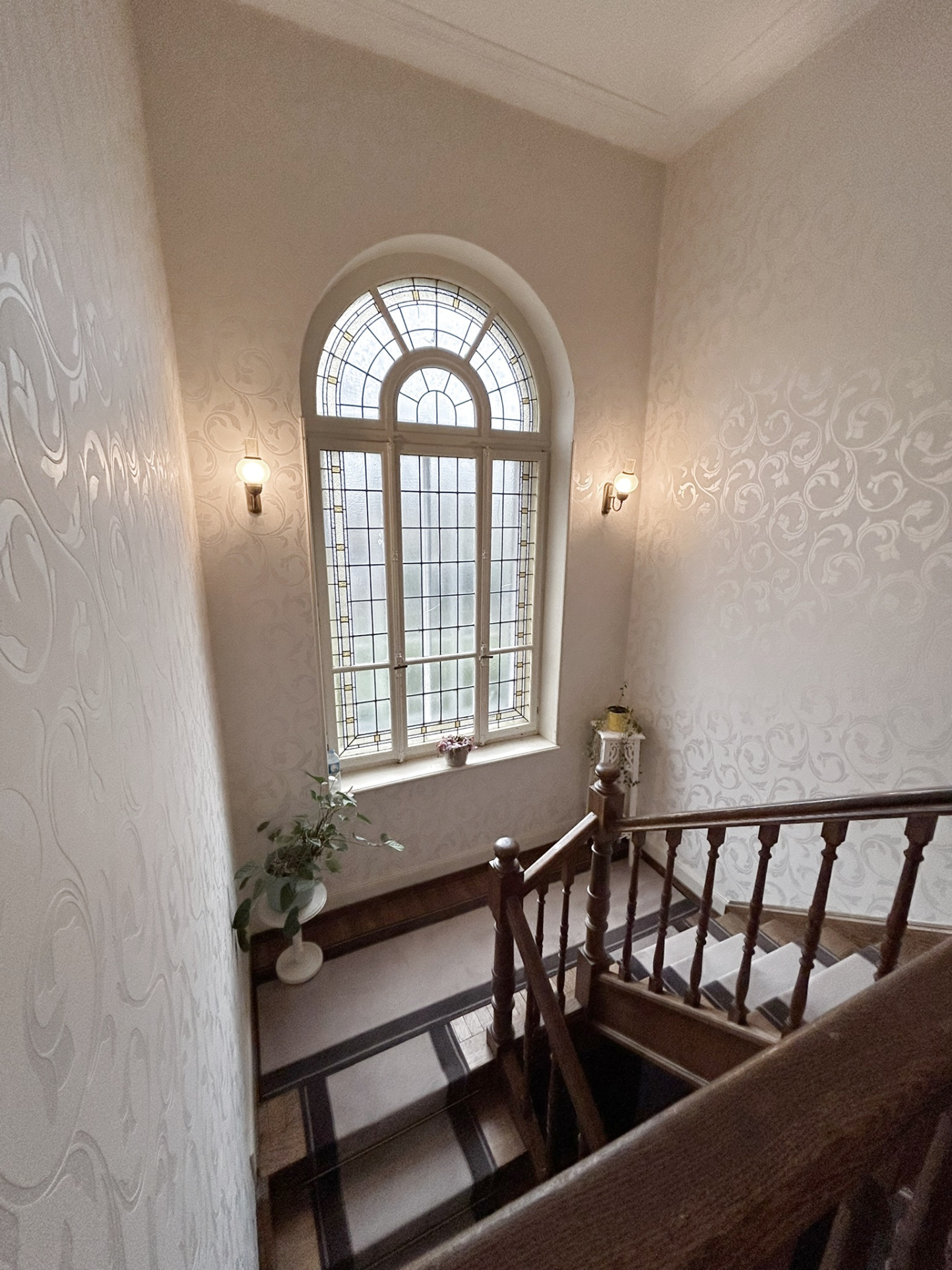 Un bel et majestueux escalier central donne l'accès aux pièces de l'étage, ainsi qu'un second escalier de service se trouvant dans une pièce arrière, afin de donner l'accès au personnel dans les temps anciens.