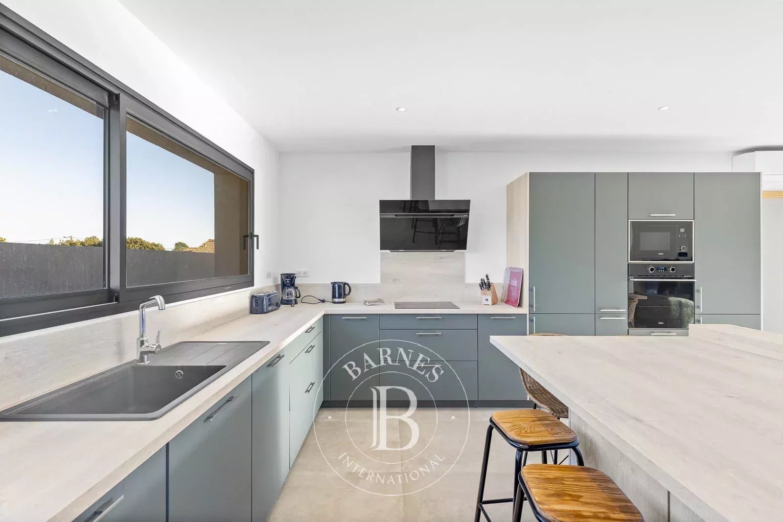 L’espace de vie lumineux comprend un salon, une salle à manger et une cuisine ouverte, le tout s'ouvrant sur une terrasse partiellement couverte avec vue sur le jardin.