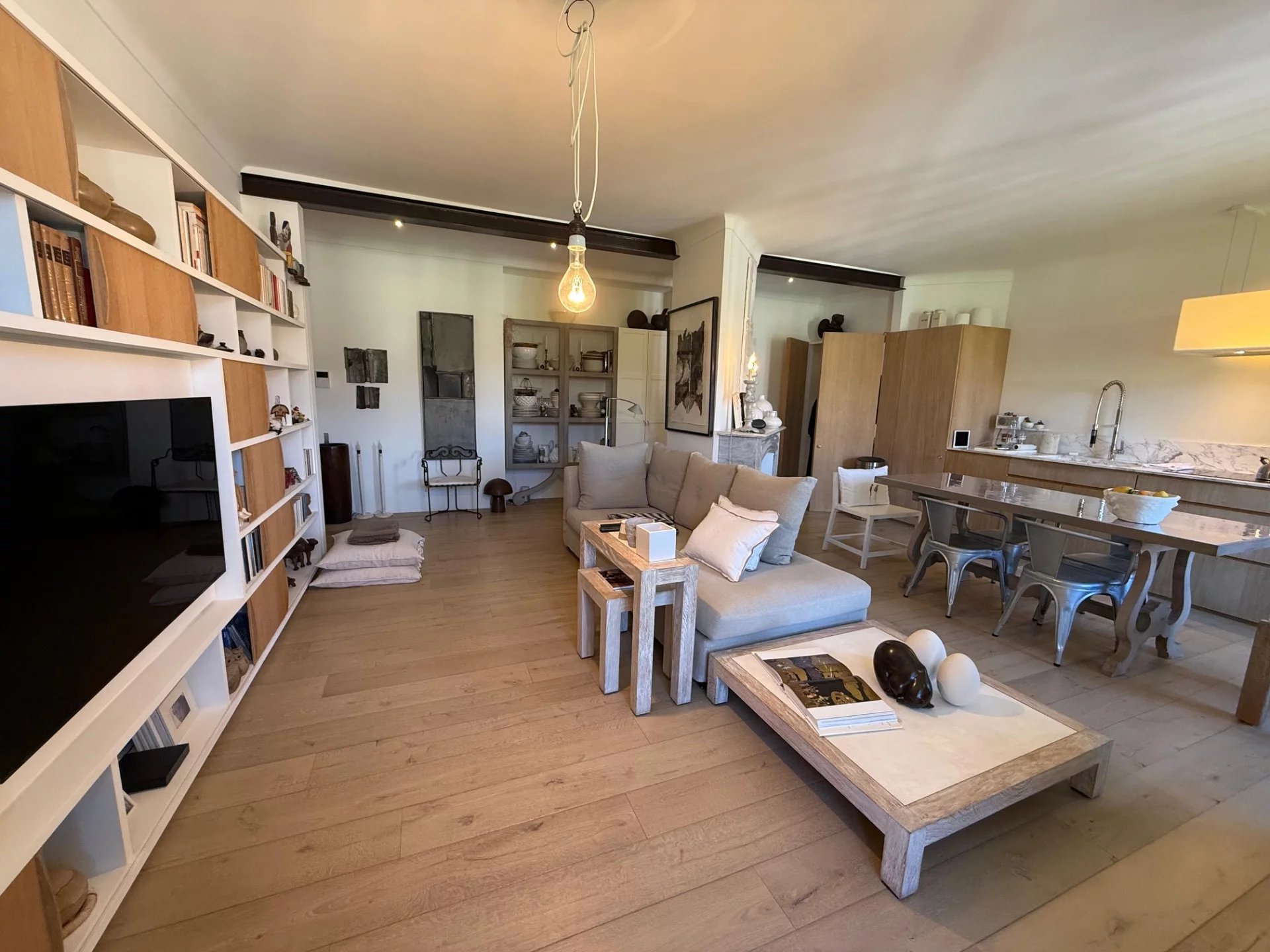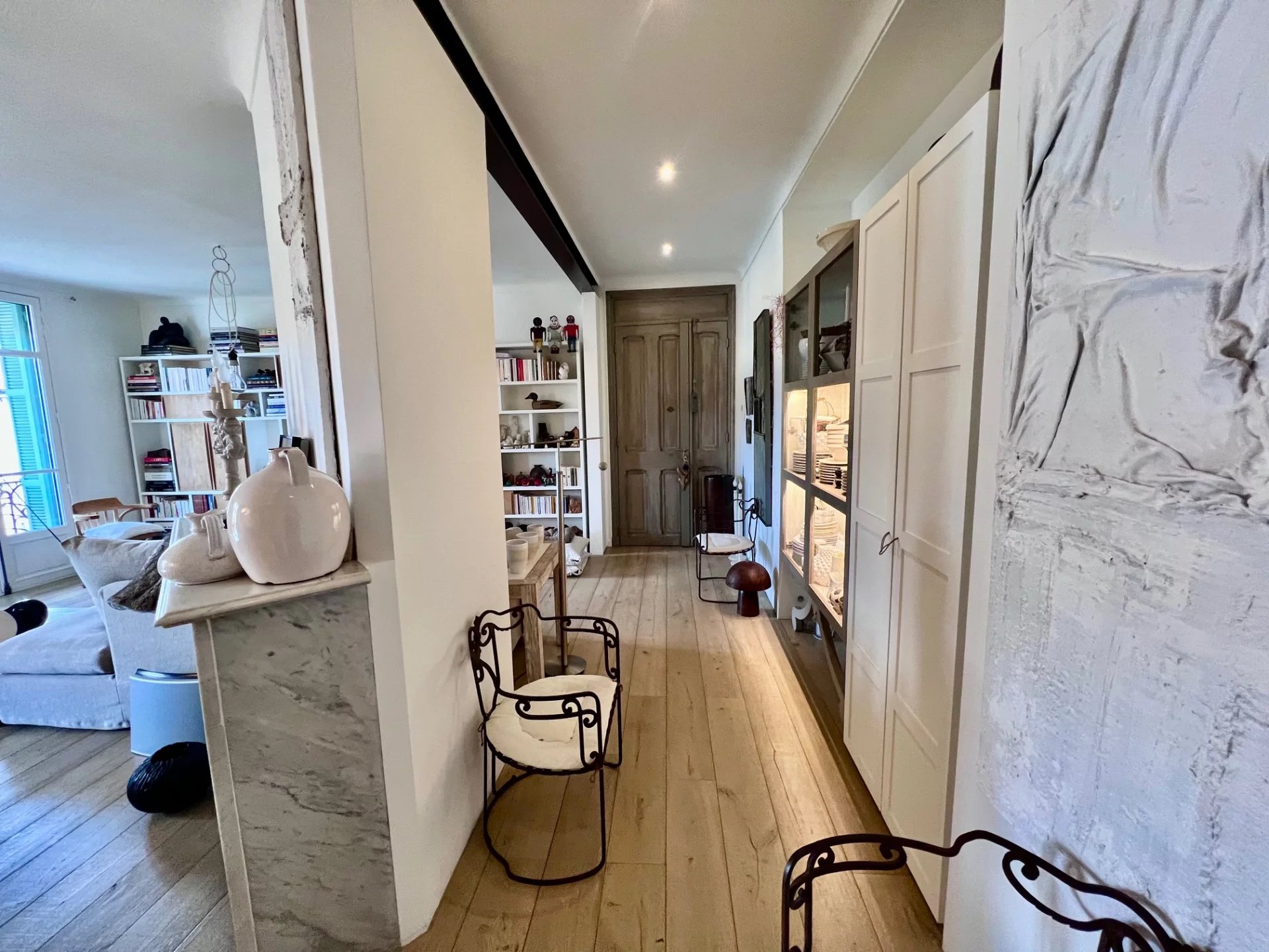 L'appartement dispose d'un séjour avec deux belles cheminées, d'une grande chambre au calme, d'une cuisine ouverte et équipée (en chêne conçue sur mesure) d'un grand dressing, d'une salle d'eau et des WC.