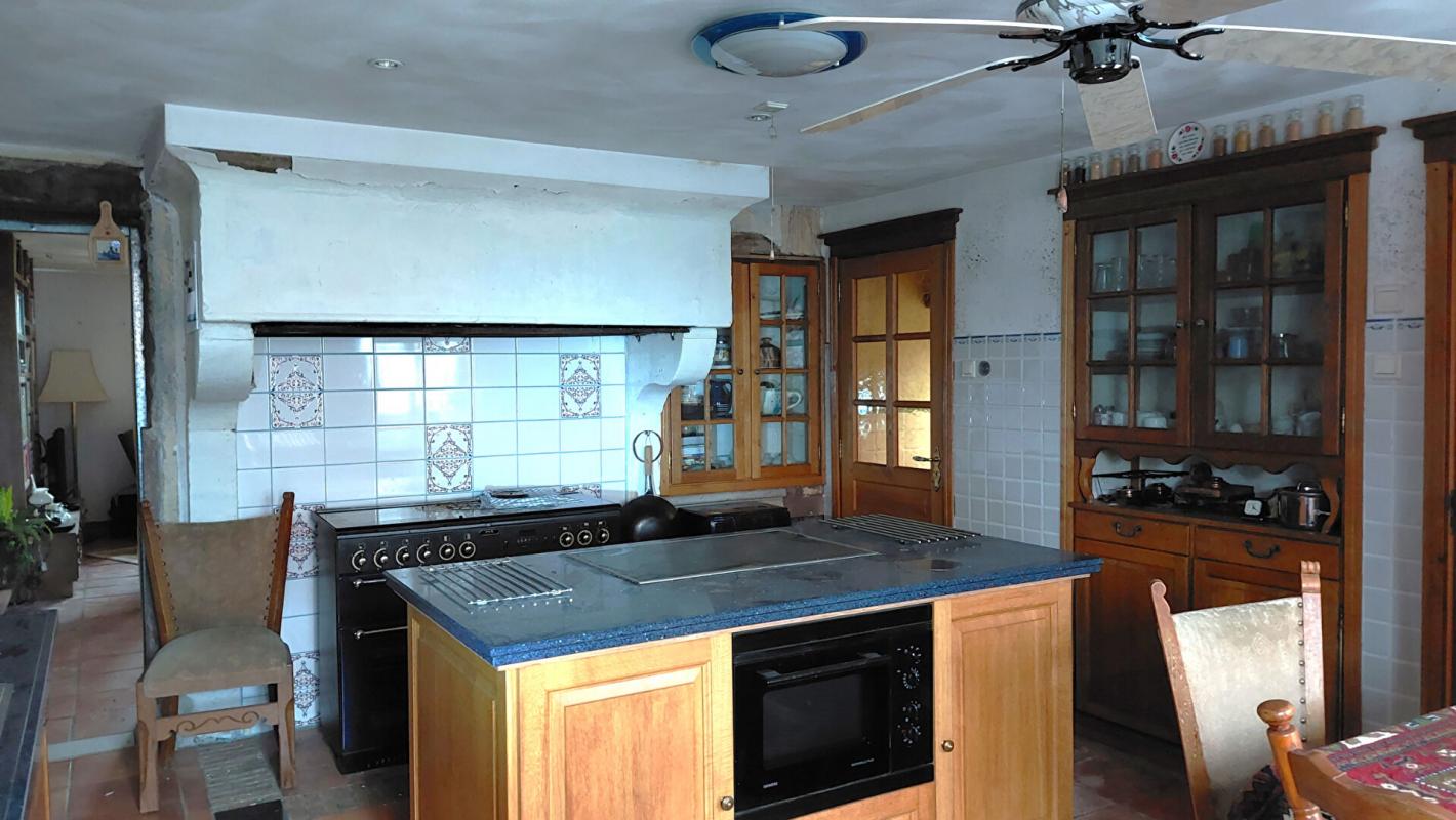 Maison de 137m2 sur terrain clos de 1119m2, proposant, une entrée avec fourneau à bois, cuisine entièrement équipée avec piano et ilot central, salon, séjour, salle d'eau, wc indépendant