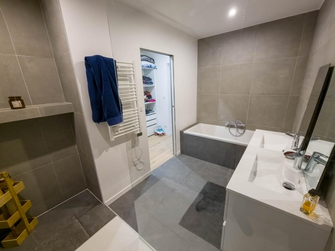 Elle a une vie de plain-pied. Suite parentale au rez-de-chaussée avec dressing et salle de bains avec douche et baignoire, double vasque. WC séparés.