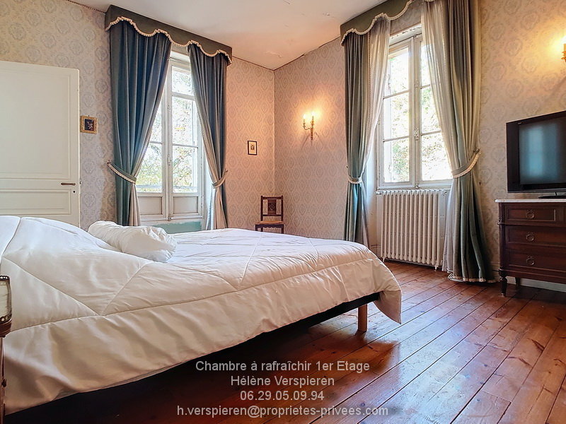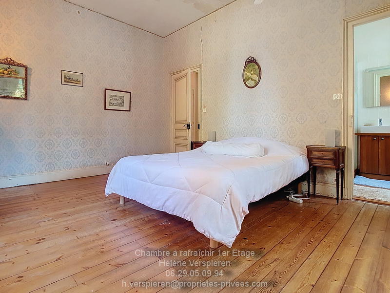 Au premier étage un large palier dessert quatre grandes chambres dont une avec terrasse privée, une autre avec cabinet de toilette, la troisième avec une salle de bains neuve. Les quatre chambres sont à rafraîchir.