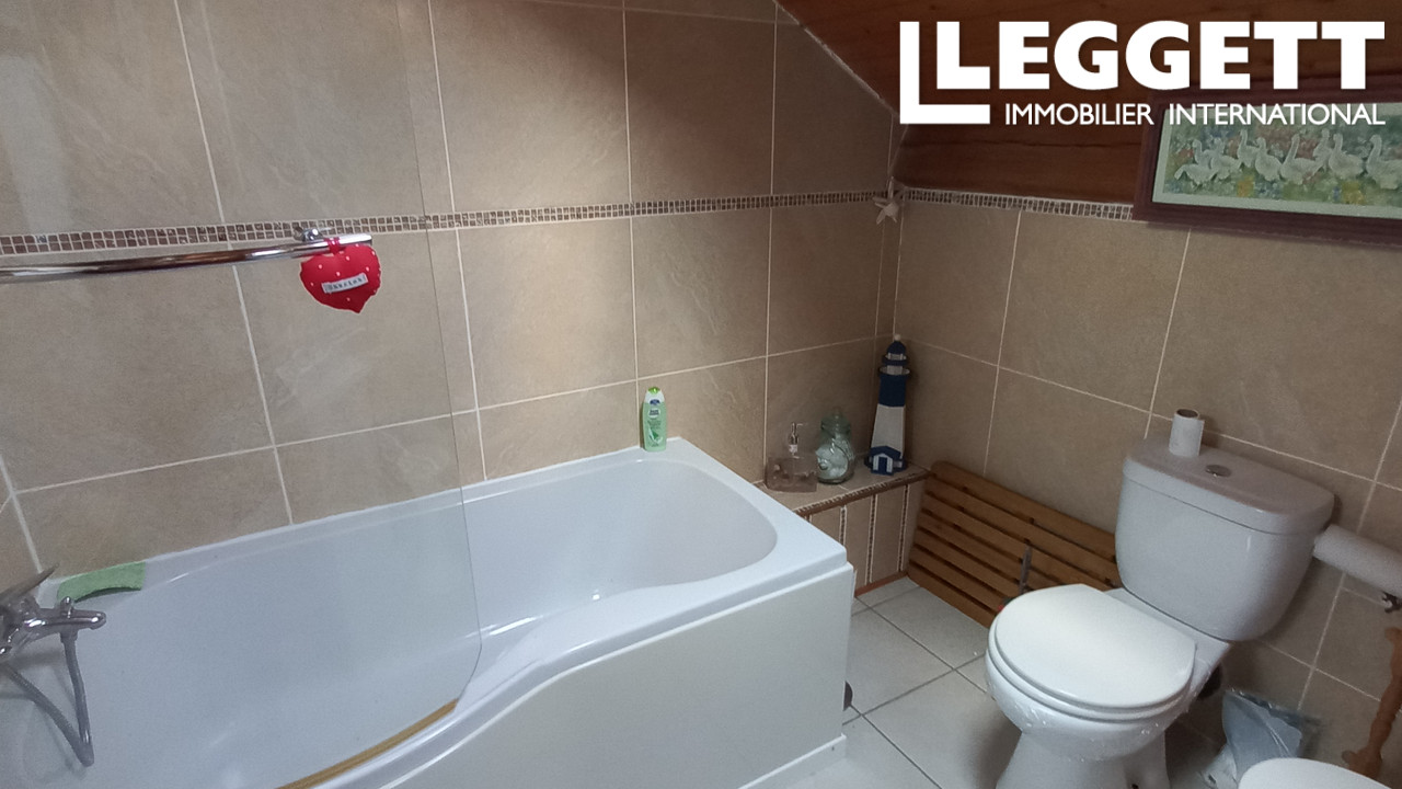 A l'étage, il y a trois chambres et beaucoup d'espace de rangement. A l'étage également, une salle de bains avec douche/ bain et toilettes. La maison dispose d'un grand jardin et d'un garage.