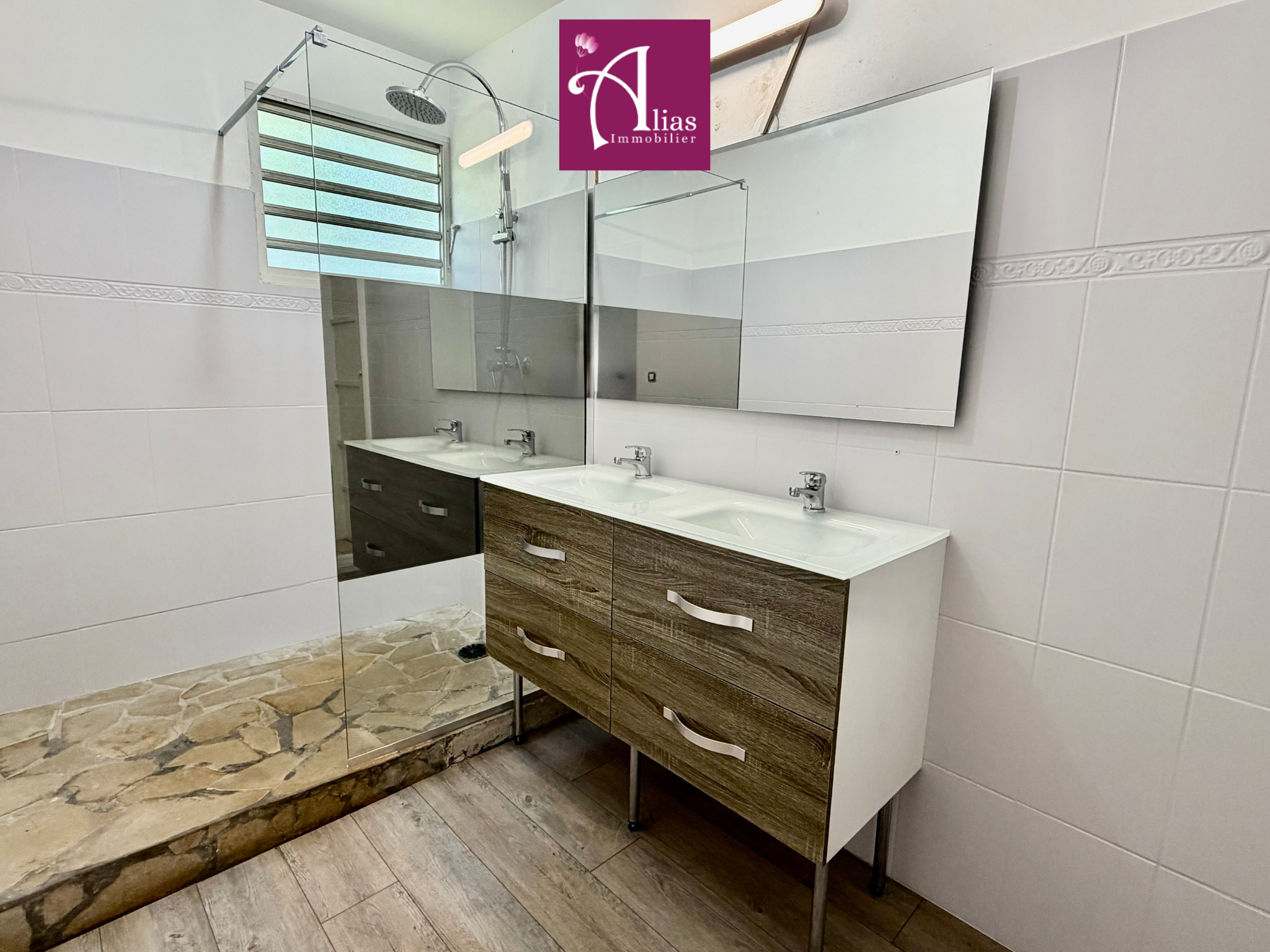 Lumineuse et fonctionnelle, elle se compose d'un séjour convivial avec cuisine américaine neuve et aménagée, d'un cellier, de trois grandes chambres climatisées avec placards, d'une salle d'eau et d'un WC indépendant, d'une grande terrasse couverte.