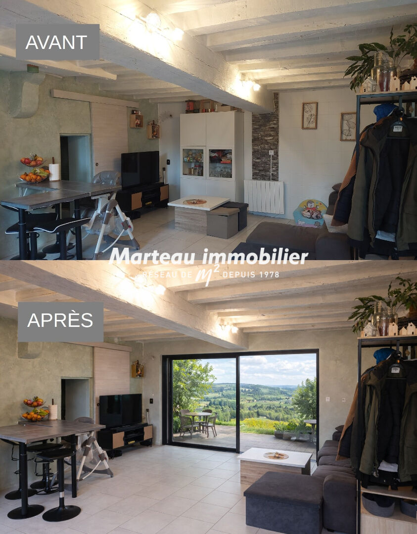 - Un séjour d'environ 39m² avec ses poutres apparentes et sa verrière au style industriel, suivi d'un espace cuisine, d'une buanderie avec wc.