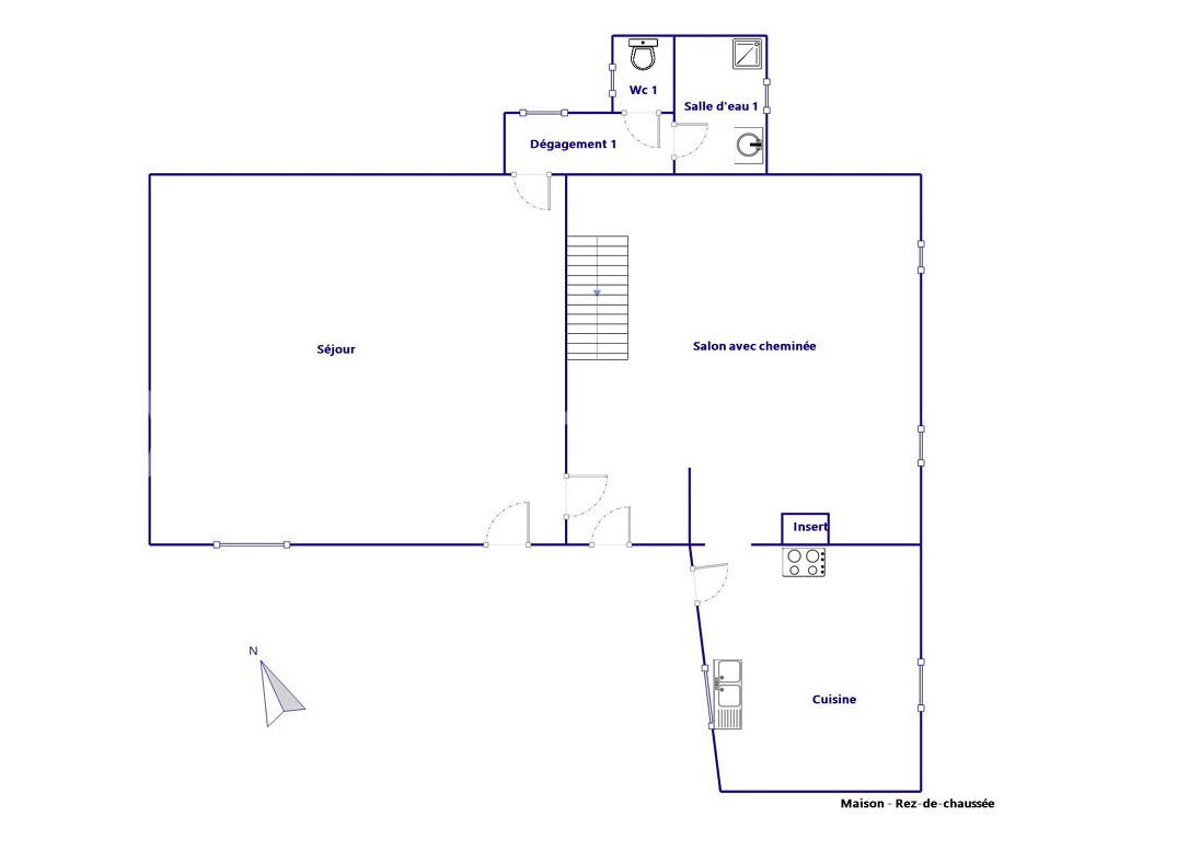 Pièce de vie de 40 m² env. Salon avec cheminée. Cuisine aménagée.