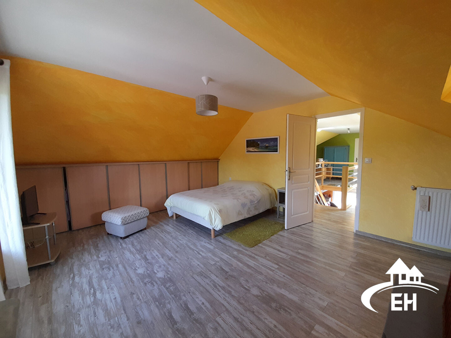 A l'étage, la pièce palière lumineuse à usage de bureau dessert deux belles chambres dont une avec balcon et la vue sur le magnifique terrain, un dressing et une salle d'eau avec wc.