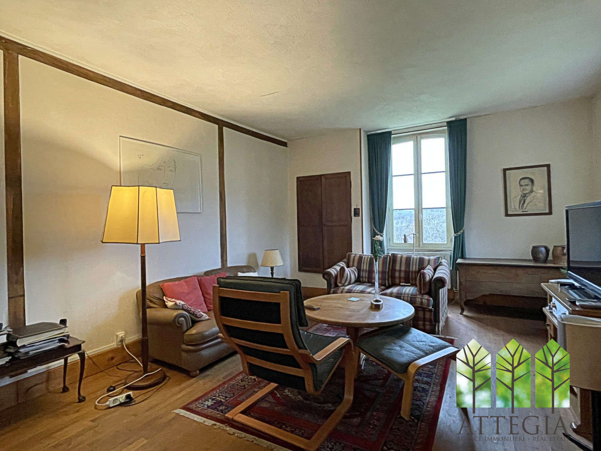A droite, un séjour de 40 m2 avec sol parquet ,cheminée et insert. Accès à une jolie terrasse avec une belle vue.