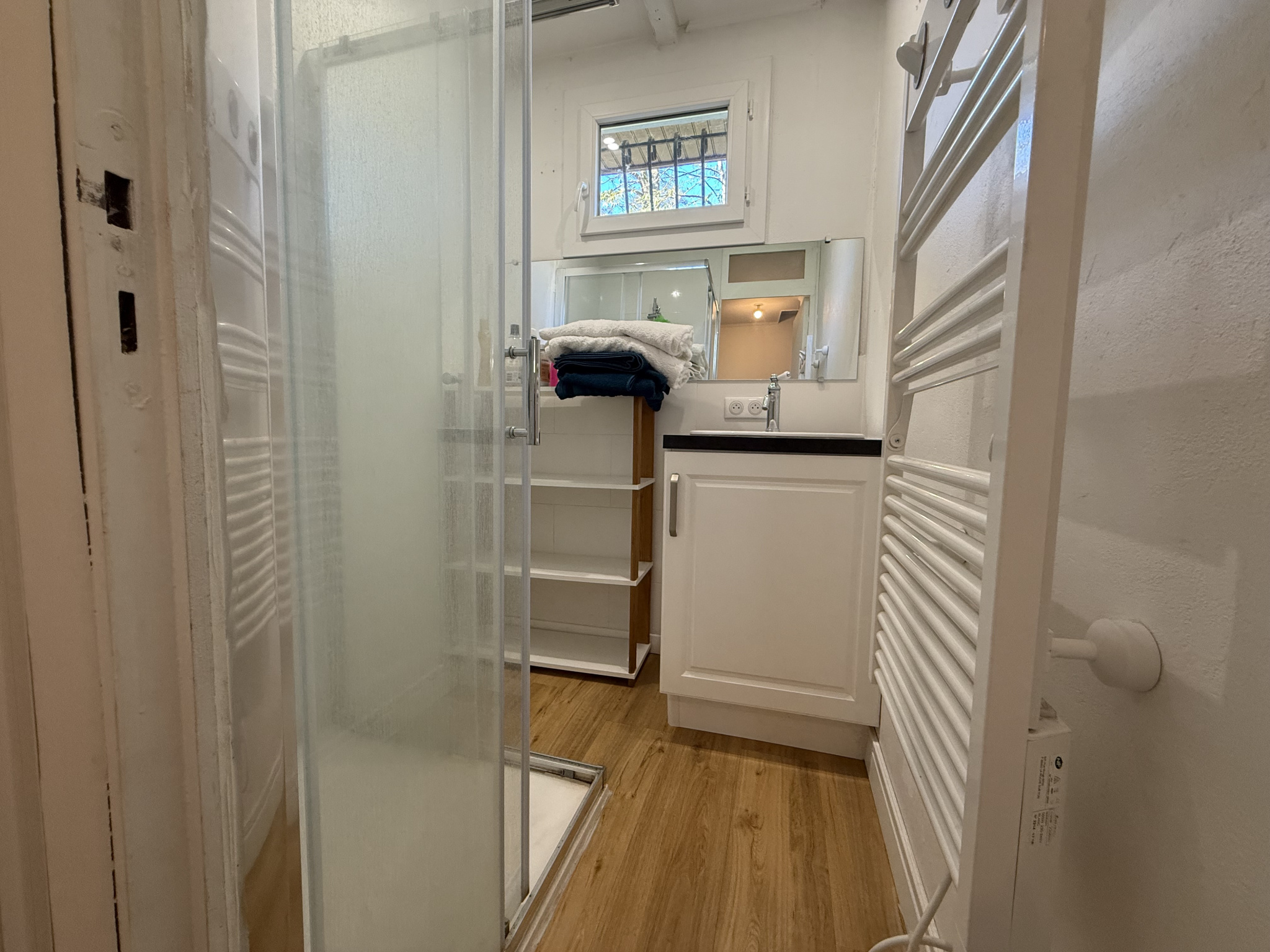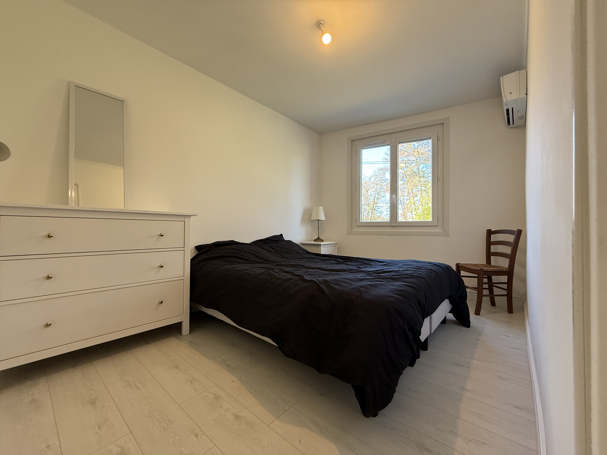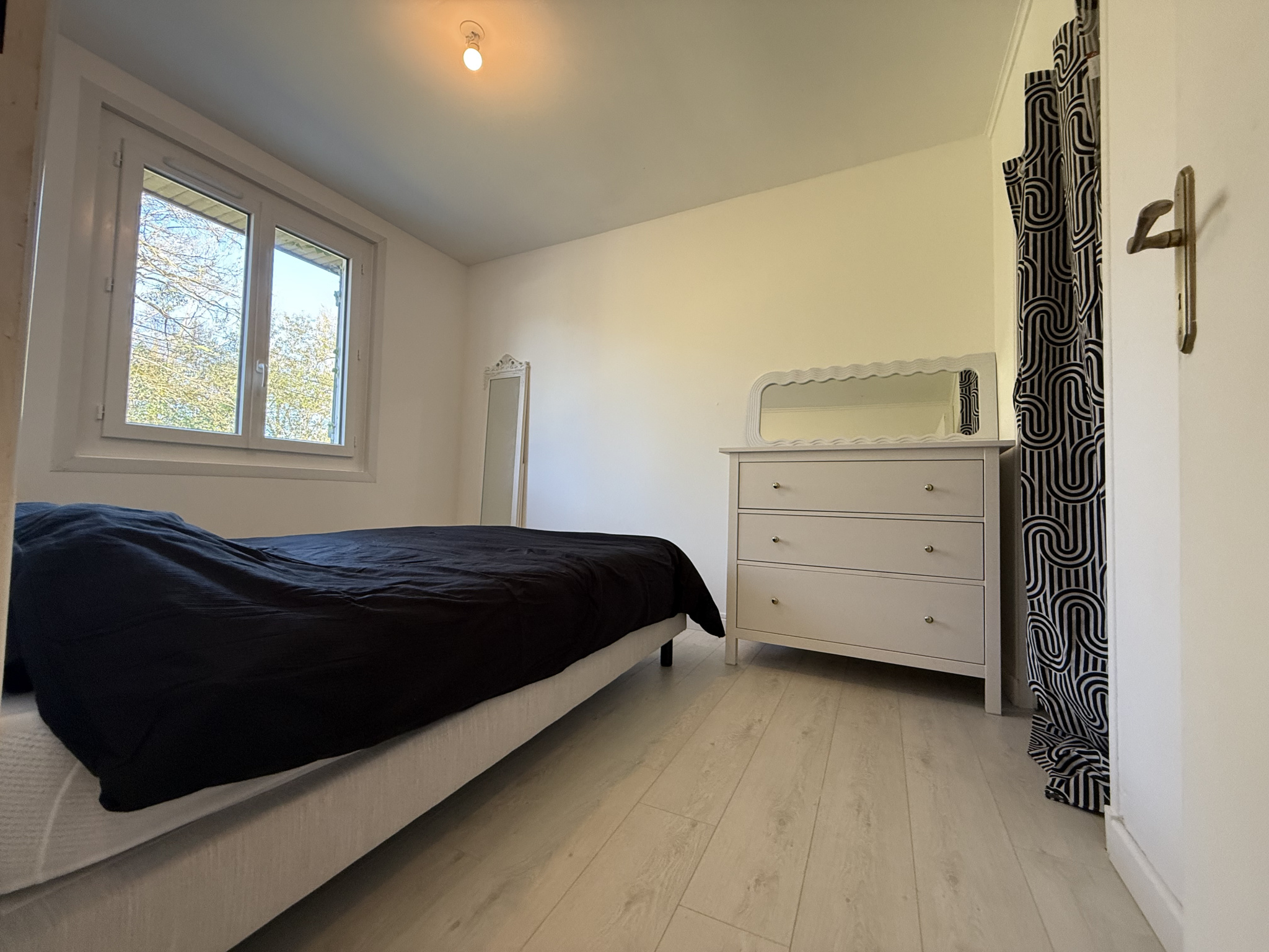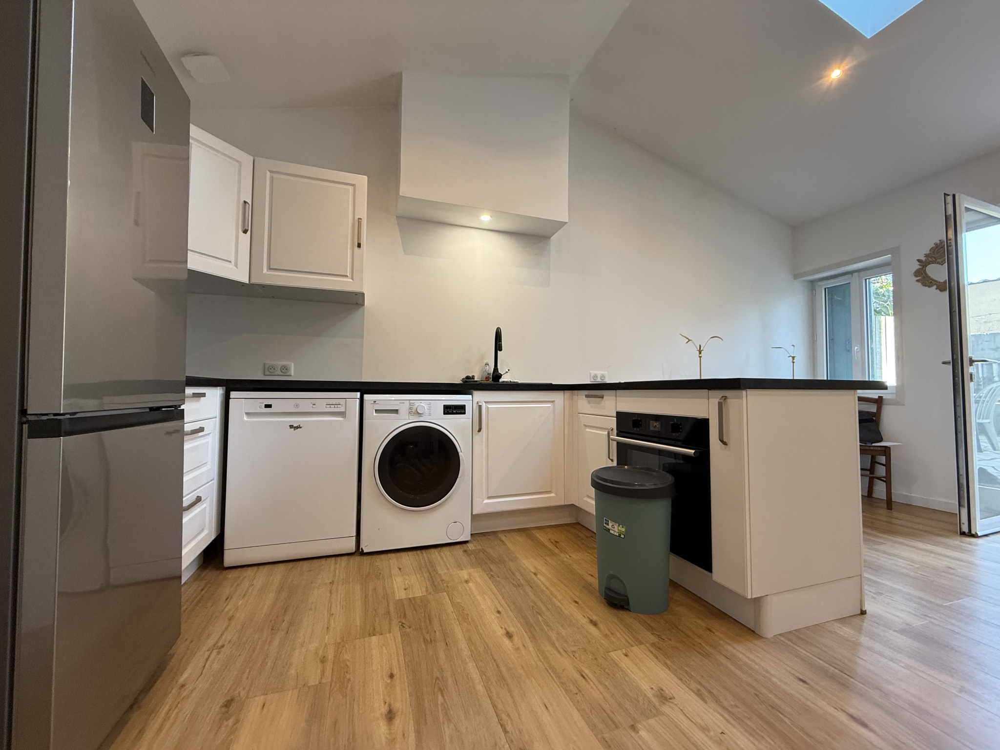 Elle se compose d'une cuisine meublée et équipée, ouverte sur un séjour lumineux, créant ainsi un espace de vie convivial et fonctionnel. En contrebas, un dégagement dessert deux chambres et une salle d'eau.