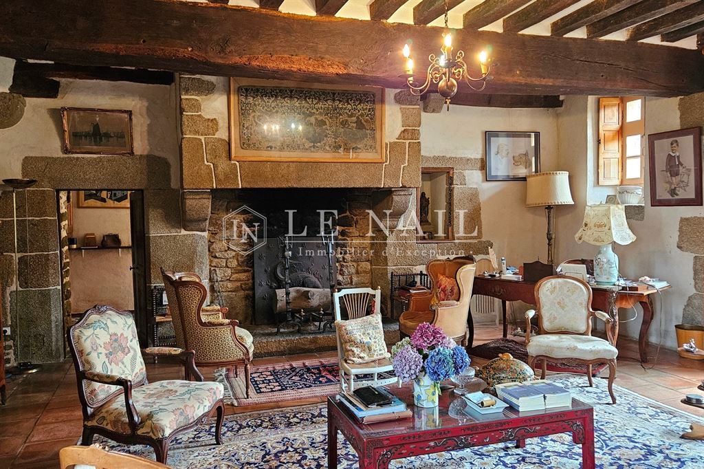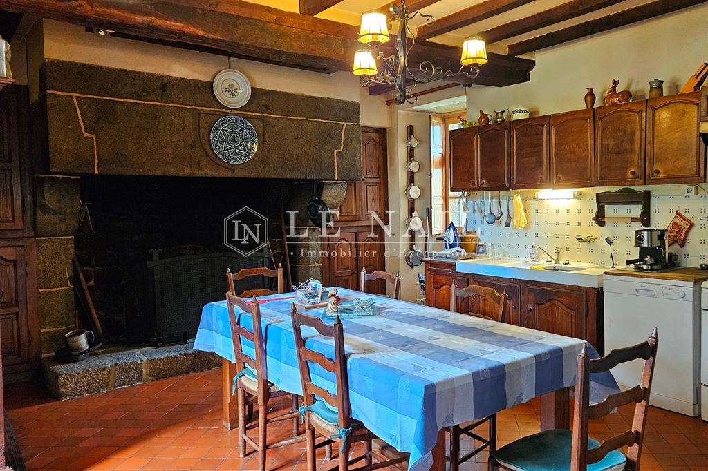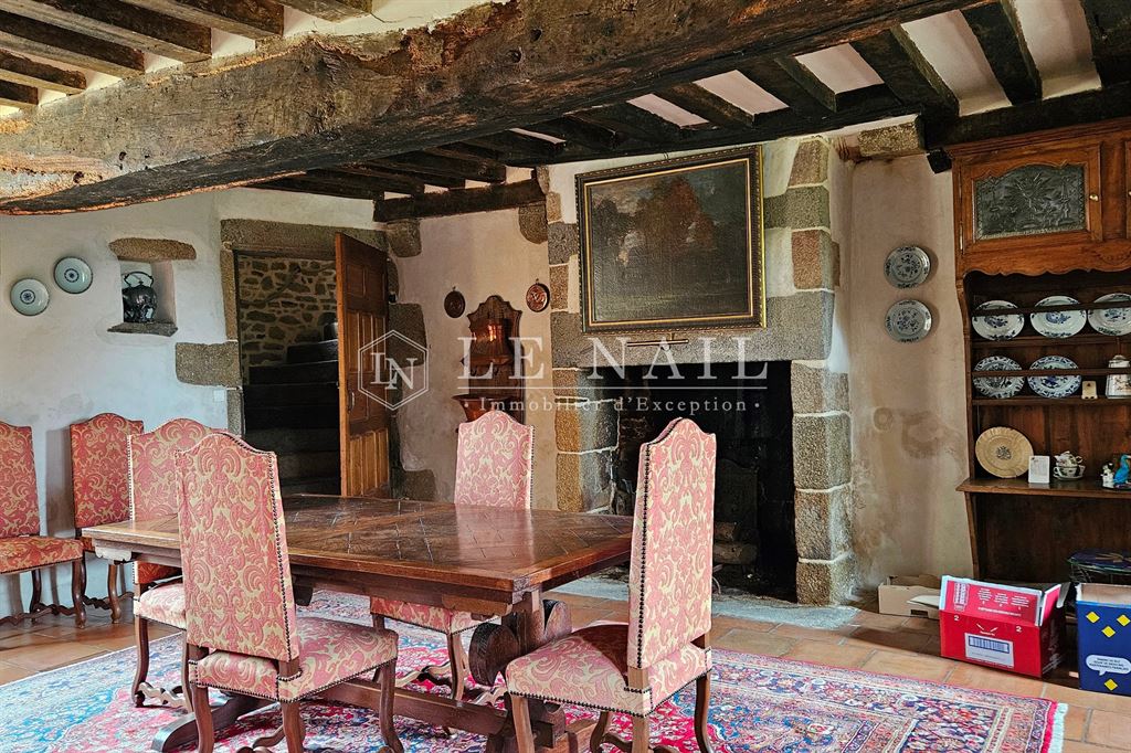 - la Salle à manger en lanterne, 36 m², hsp de 2.4 m, avec sol carrelé, plafond à poutres apparentes et cheminée en granit, une cuisine accessible du salon, avec sol carrelé, plafond à poutres apparentes, cheminée monumentale en granit, double exposition, accès direct vers l’extérieur, un cellier et une chaufferie.