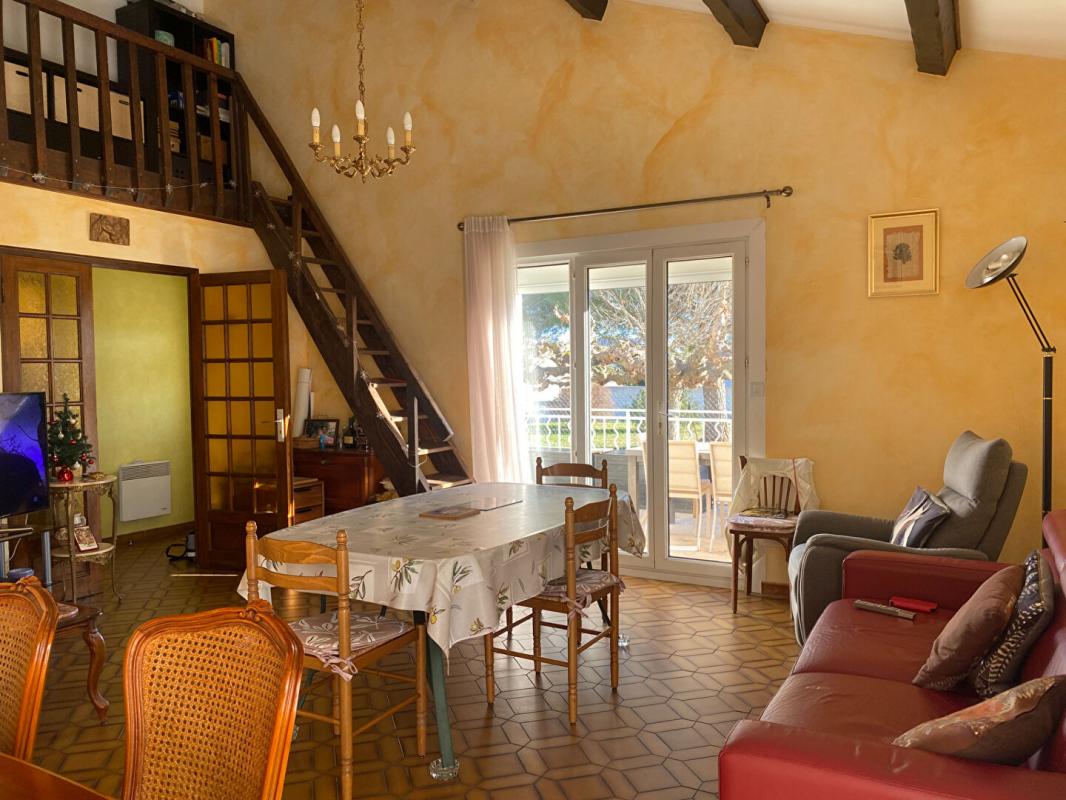 Un T4 de plain pied, avec cuisine, un grand séjour donnant sur la terrasse et piscine, trois chambres, sdb, wc et une mezzanine .