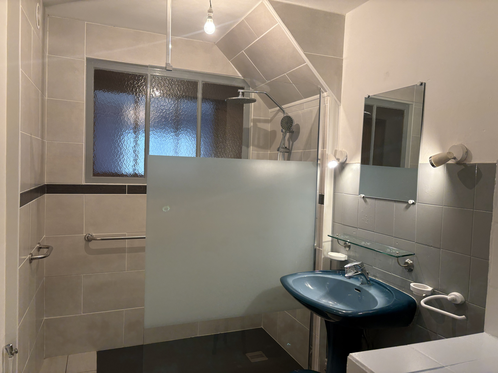 Au rez-de-chaussée : cuisine, séjour, chambre, salle de douches et wc