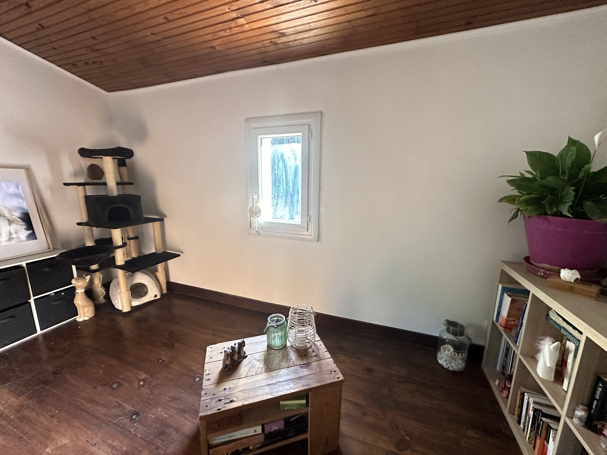 La maison édifiée sur une parcellle de plus de 5000 m2 et comprend une entrée, une espace de vie avec poêle à granules, une cuisine, une chambre, En demi-niveau supérieur : wc, sdb et une chambre avec placards.