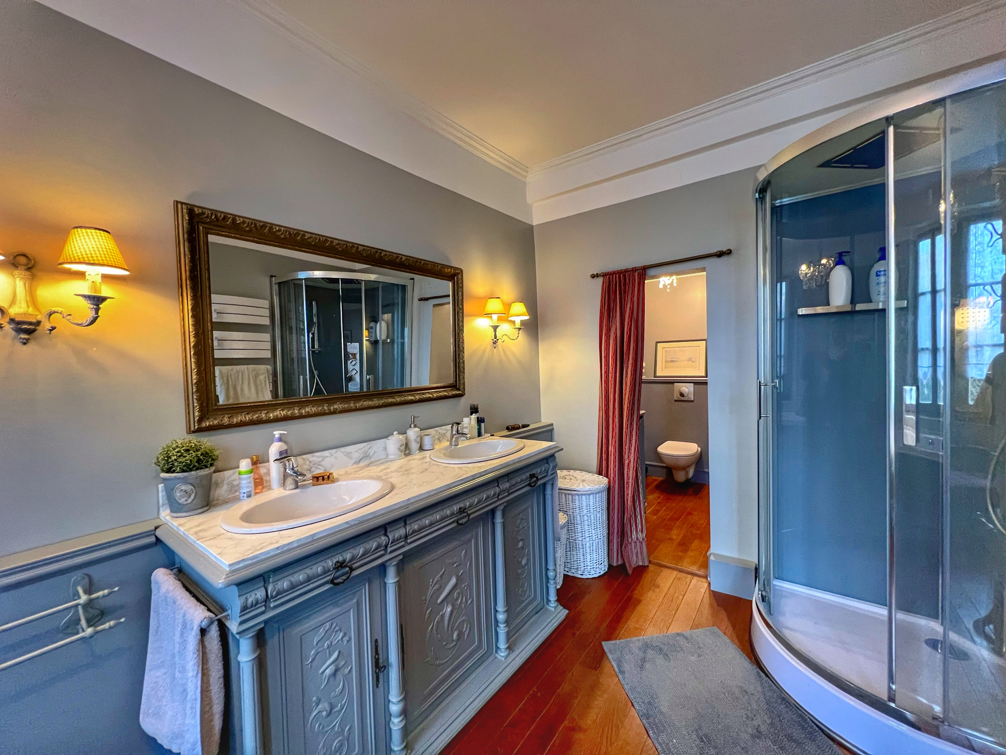 À l'étage : trois grandes chambres de plus de 17 m2, une salle de bain élégante avec baignoire, douche et dressing intégré,