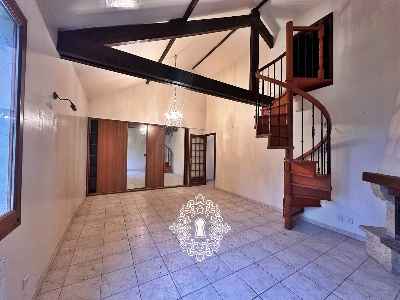 entrée, cuisine, séjour cathédrale (cheminée avec insert), salle à manger, 3 chambres, salle de bains, wc,