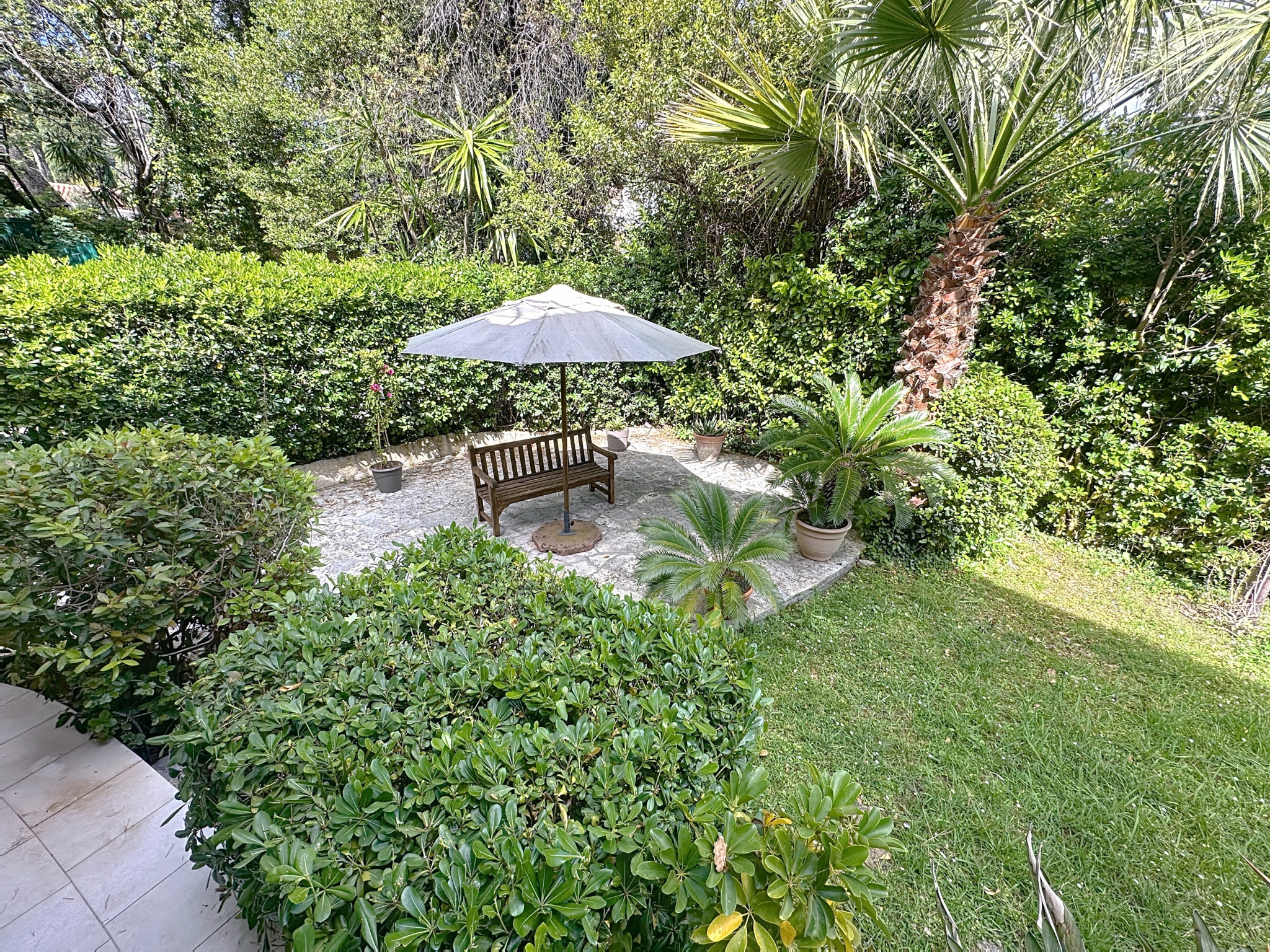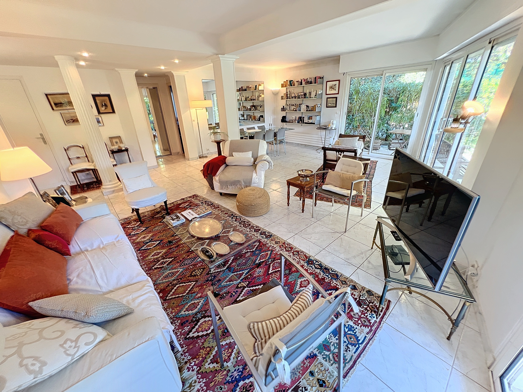 Cannes Montfleury dans un domaine et un petit immeuble intimiste de 5 privilégiés, très bel appartement de 109 m2, en Rez-de-jardin, avec double séjour, cuisine séparée, 2 vastes chambres avec chacune sa salle de bains, dressing , 2 caves, 2 parkings réservés sur parking sécurisé, largement ouvert sur terrasse d'angle et jardin en jouissance de 250 m2 environ. charges courantes annuelles 5.650 euros chauffage compris. petite copropriété de 6 lots principaux dans Domaine sécurisé. Possibilité de faire un 4 Pièces.