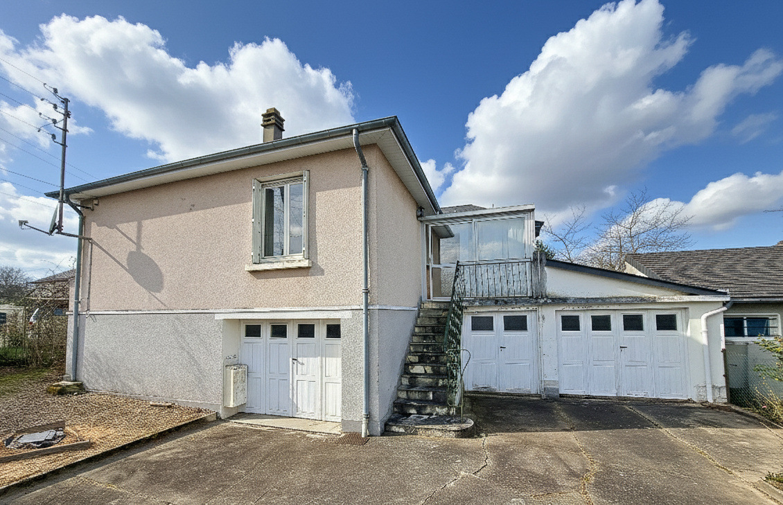 Plain pied surélevé des années 50 à rénover avec entrée avec véranda, séjour, cuisine, deux chambres avec placard, salle de bains, wc.