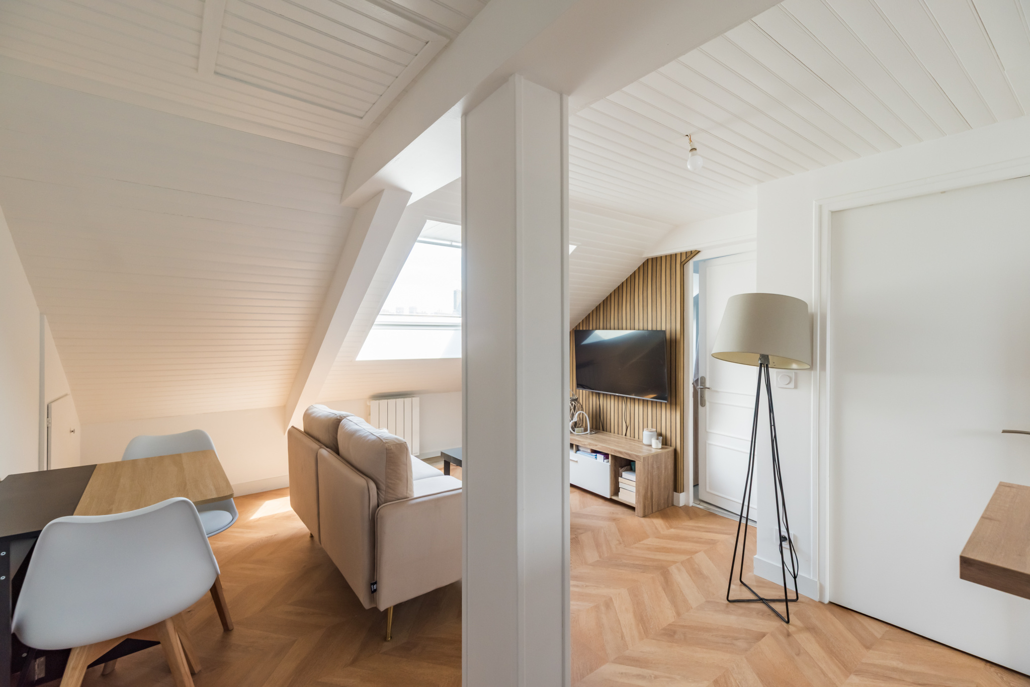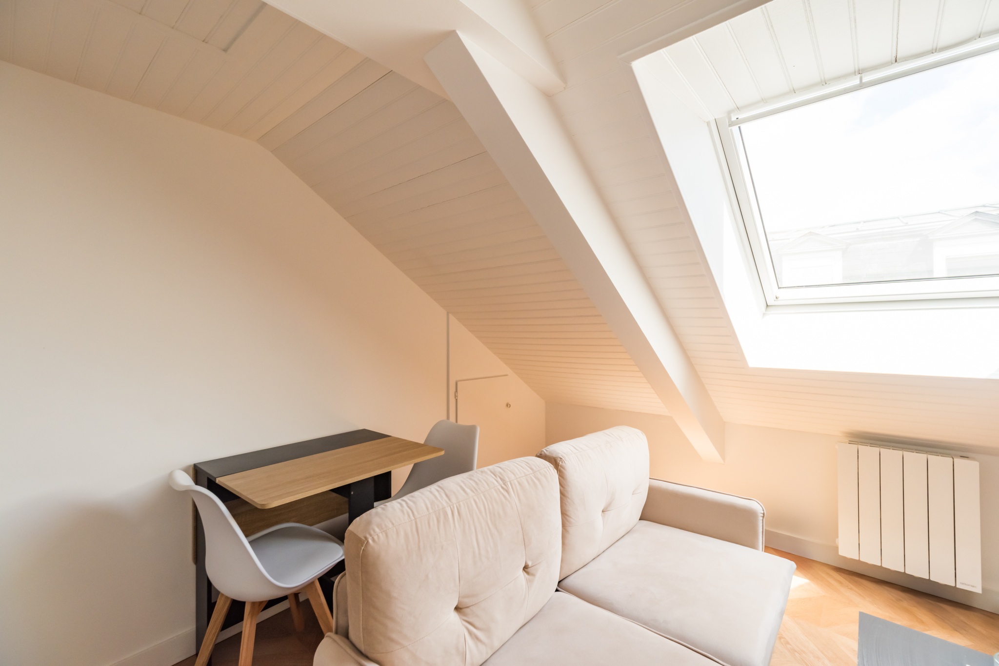 Ce logement de 20 m2 loi carez mais de 35m2 au sol comprend une salle d'eau, un espace salon lumineux de 15 m2, une chambre et une cuisine fonctionnelle totalement équipée. Situé au 3e et dernier étage, il offre calme et confort grâce à ses fenêtres à double vitrage.