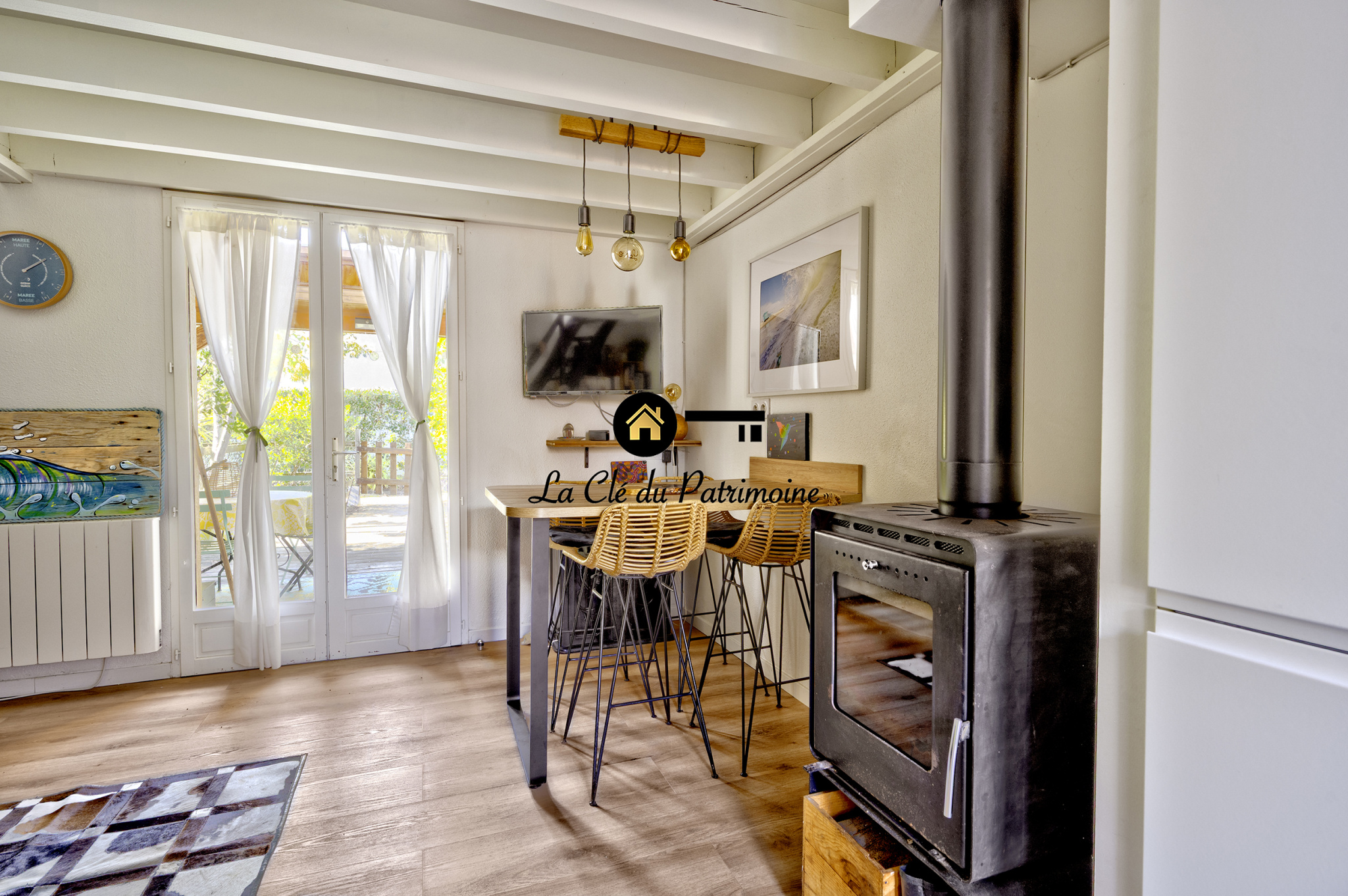 La maison comprend au rez de chaussée : un jardinet à l'avant qui intègre une belle terrasse couverte, une pièce de vie traversante avec poêle à bois, une cuisine entièrement aménagée et équipée, une terrasse à l'arrière avec deux cabanes pour ranger les vélos et les affaires de plage, une salle d'eau avec douche, lavabo et lave linge, un WC séparé avec lave main.