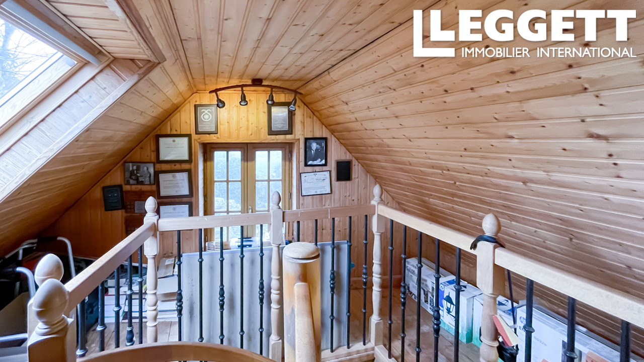 Au coeur de la maison est une grande cuisine familiale, avec un mur en pierre apparente et une belle cheminée équipée d'un insert à bois. Un escalier en colimaçon mène à une mezzanine, actuellement utilisée comme espace bureau. La cuisine est équipée de placards en chêne d'un four électrique intégré, d'une lave-vaisselle et d'une plaque de cuisson à gaz. Un (espace) cellier à l'arrière offre un excellent espace de rangement.