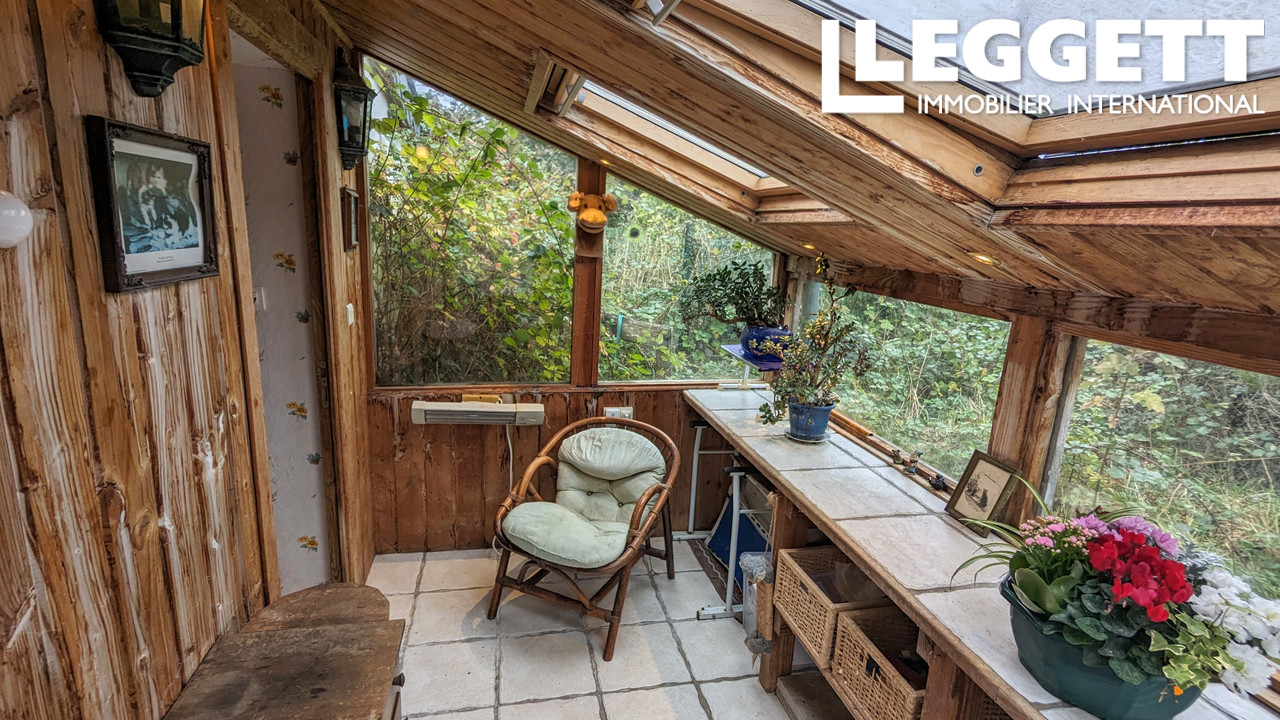 Le salon spacieux comprend une cheminée avec un insert à bois, et mène à une buanderie, puis à une véranda à l'arrière avec des portes donnant sur le jardin.