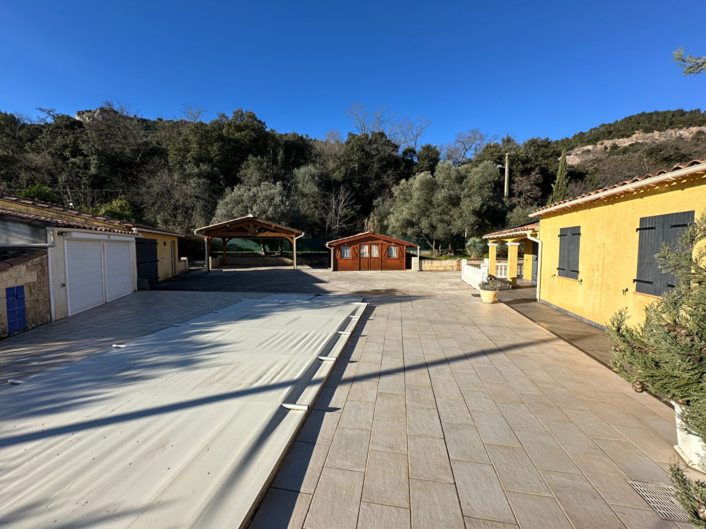 Du côté extérieur, avec son jardin paysagé et entretenu, ce bien vous propose deux terrasses; nord et sud, une piscine, un grand garage / atelier, un pool-house, un car-port et un chalet en bois d'une surface approximative de 18m².