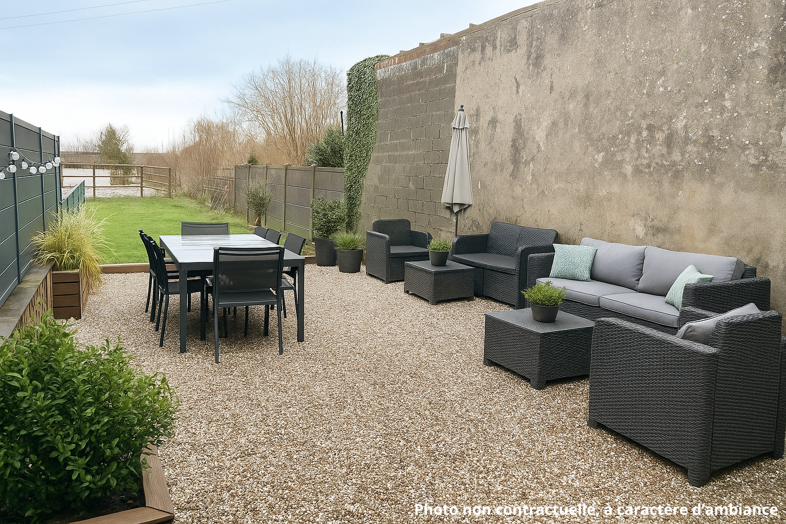 À l'extérieur, un joli jardin clôturé. Ainsi qu'en annexe, un garage pour une voiture avec un atelier et un grenier vous permettront de bricoler un peu.