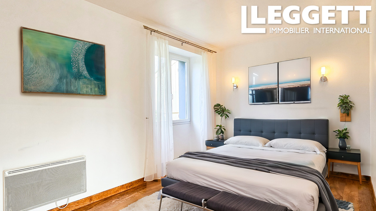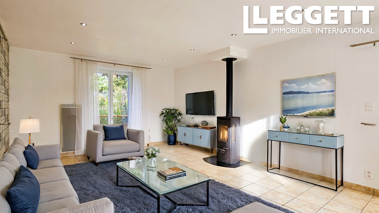 En entrant dans le salon qui dispose d'un poêle à bois et de portes vitrées sur la terrasse arrière, à gauche se trouvent trois chambres (deux doubles, une simple), une salle de bain avec baignoire, lavabo et douche à l'italienne et un WC séparé . Sur le côté droit de la maison se trouve une suite parentale avec salle d'eau/WC attenante et vue sur le jardin arrière. Le couloir s'ouvre sur une grande cuisine avec des plafonds de 5,5 m de haut et des poutres apparentes. Des portes vitrées ouvrant sur les terrasses avant et arrière et deux grands velux assurent une pièce très lumineuse. Un grenier au-dessus a été bien isolé et contient deux ballons d'eau chaude, un pour chaque côté de la maison.
