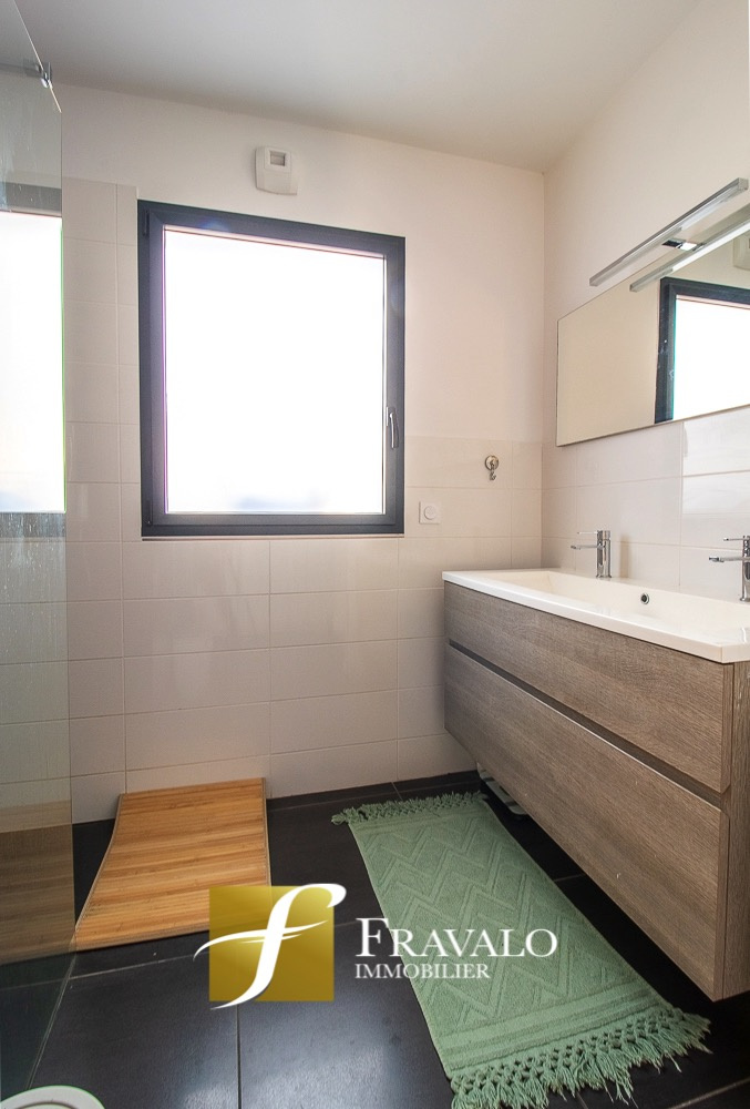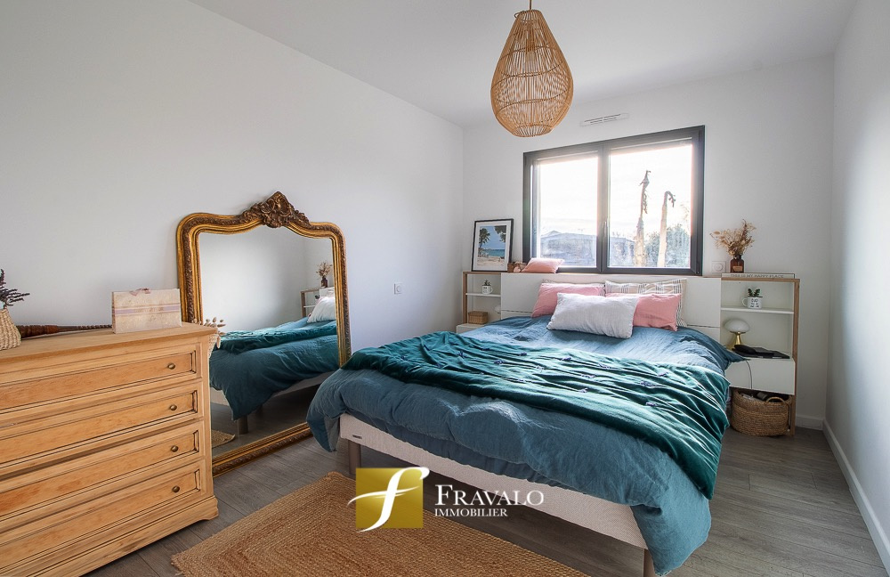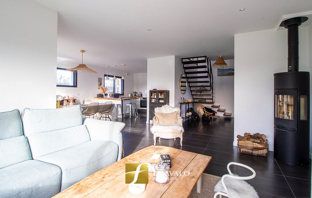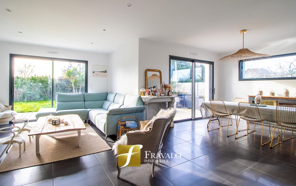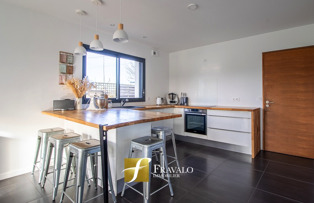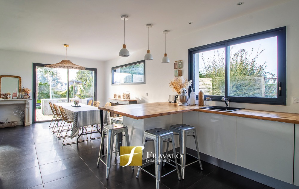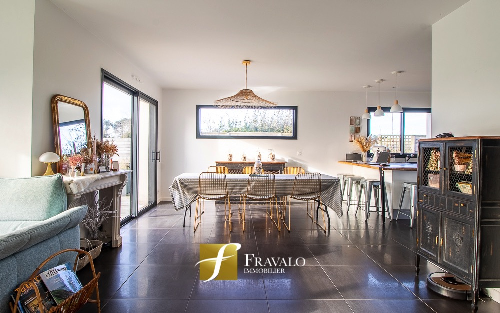 Idéalement située à seulement 5 minutes à pied du bourg de Plescop, des arrêts de bus et des écoles et à 9km du centre de Vannes, cette belle contemporaine de 2014 offre une vue dégagée et de nombreux atouts. Au rez-de-chaussée, vous découvrirez une entrée, un lumineux salon-séjour agrémenté d'un poêle à bois, une cuisine ouverte aménagée-équipée, une suite parentale avec dressing et salle d'eau, ainsi qu'un wc. A l'étage, l'espace nuit se compose de quatre chambres, dont une avec accès à un toit-terrasse aménagé, une salle de bains équipée d'une baignoire et d'une douche, et un wc. Un garage, un carport transformé en salle de sport et un cabanon viennent compléter ce bien. L'ensemble sur un terrain de 550 m2 à l'abri des regards. Estimation des coûts annuels d'énergie pour un usage standard du logement: entre 880 EUR et 1270 EUR (abonnement compris). Les informations sur les risques auxquels ce bien est exposé sont disponibles sur le site Géorisques : georisques.gouv.fr.