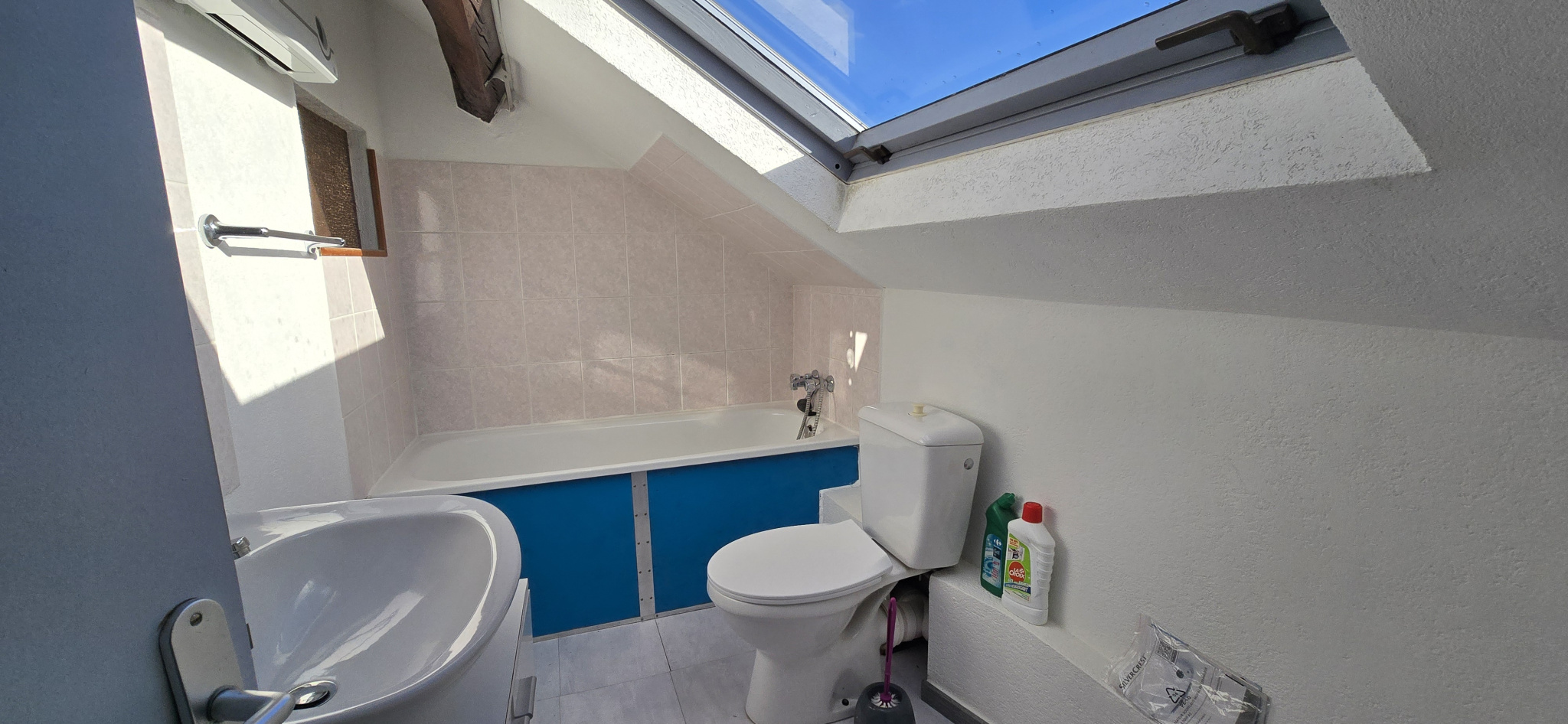 salle de bains avec toilettes, chambre, petite mézzanine.