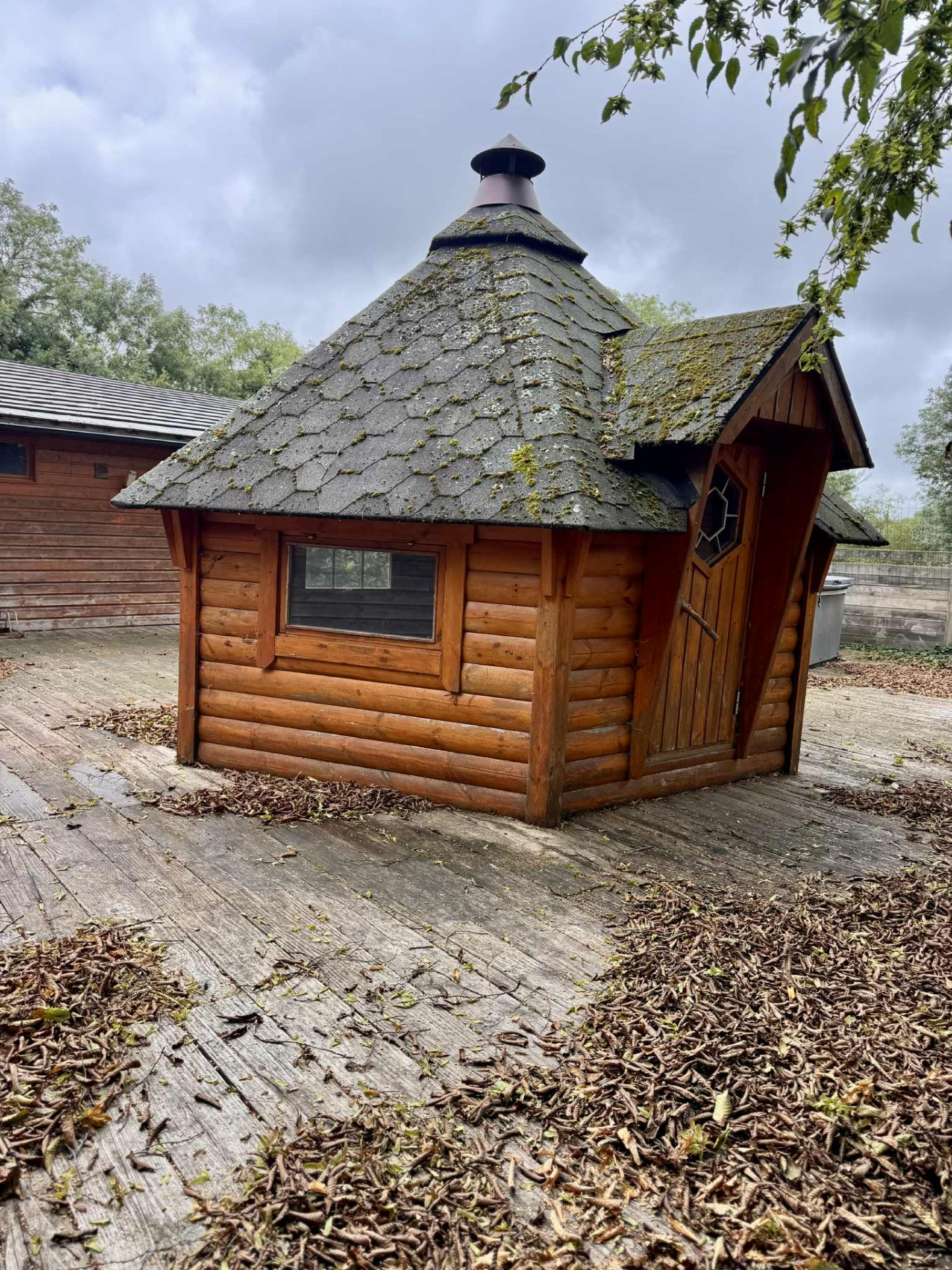 Second gîte : Un chalet en bois avec une vue imprenable sur la campagne environnante. Il offre une pièce à vivre, un coin sanitaire et deux pièces pour dormir. Sa terrasse sur pilotis est un véritable lieu de détente.