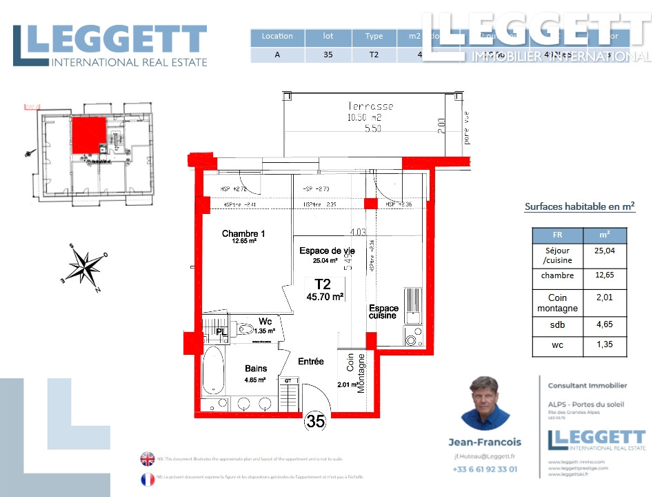 Ce superbe appartement de 45.70 m², situé au 3e étage et orienté sud-ouest, dispose d'un grand balcon de 10.50 m². Il comprend une entrée avec dressing, un spacieux séjour de 25.04 m² avec cuisine ouverte, une chambre, un coin montagne, une salle de bain et un WC séparé. Une place de parking sous carport , un parking extérieur et un casier à skis complètent ce bien.